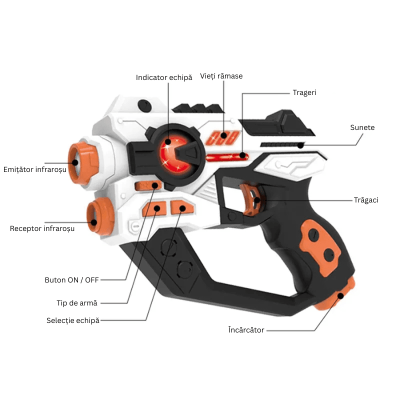 - Mod Laser Tag: doua pistoale capteaza intalnirile IR, iar modul de tragere variabil transforme fiecare meci intr-o experienta dinamica si personalizata. Copiii dezvolta tactici de echipa si invata ce inseamna fair-play: loviturile sunt “reale”, cu raspuns vizual, auditiv si tactil (vibratii).