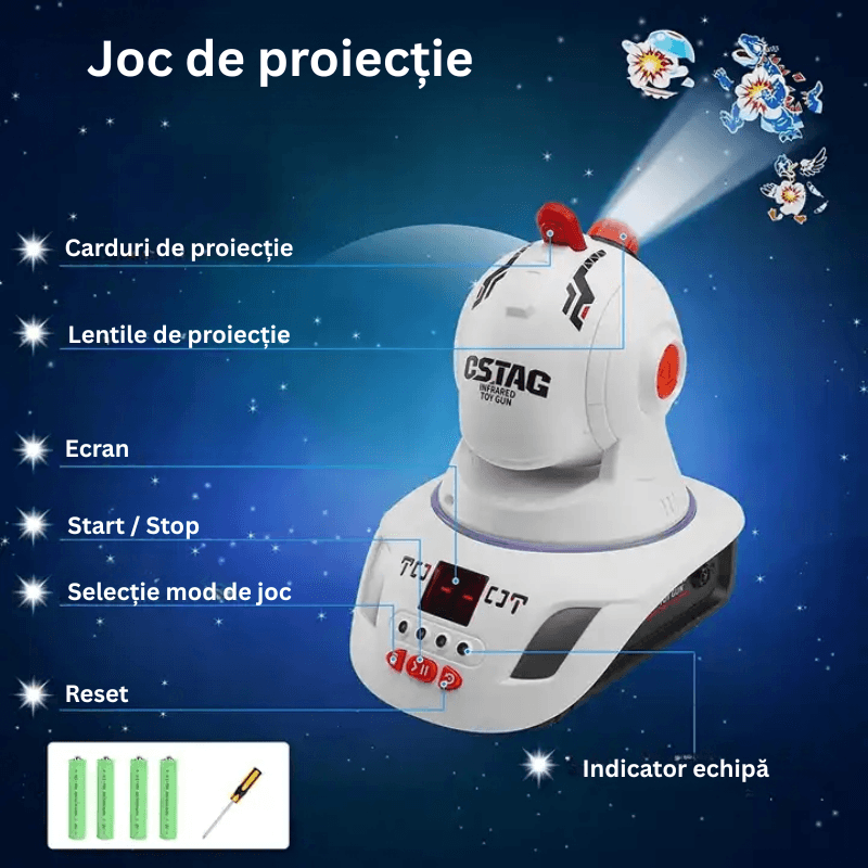 - Mod Proiector: imortalizezi scenarii fantastice in orice incapere. Fie ca vrei creaturi extraterestre, dinozauri zburatori sau rate amuzante, poti schimba cardurile in functie de tema dorita. Ecranul digital afiseaza scorul si modul de joc, iar butonul Start/Stop decide cand incepe actiunea.