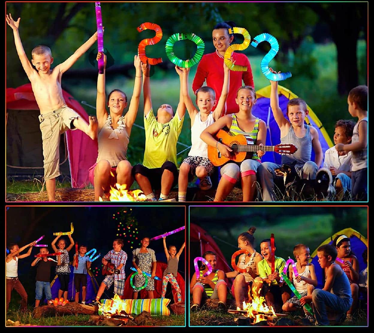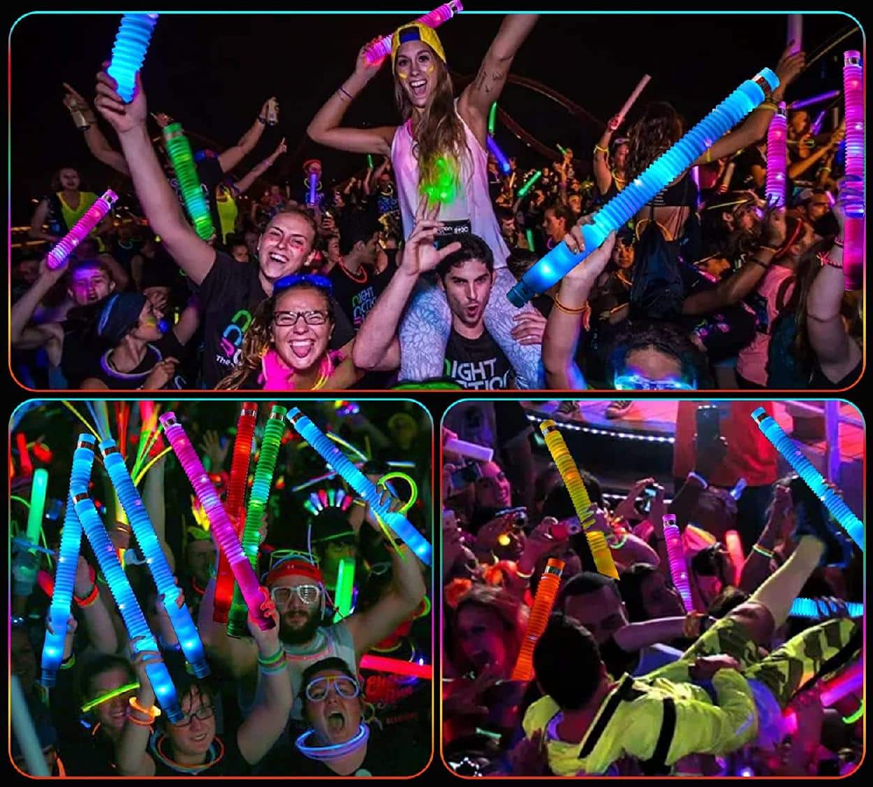 Tuburile pot fi indoite in diverse forme pentru o joaca cat mai creativa. Ele pot fi atasate impreuna pentru a forma un tub foarte lung, multicolor si luminos.