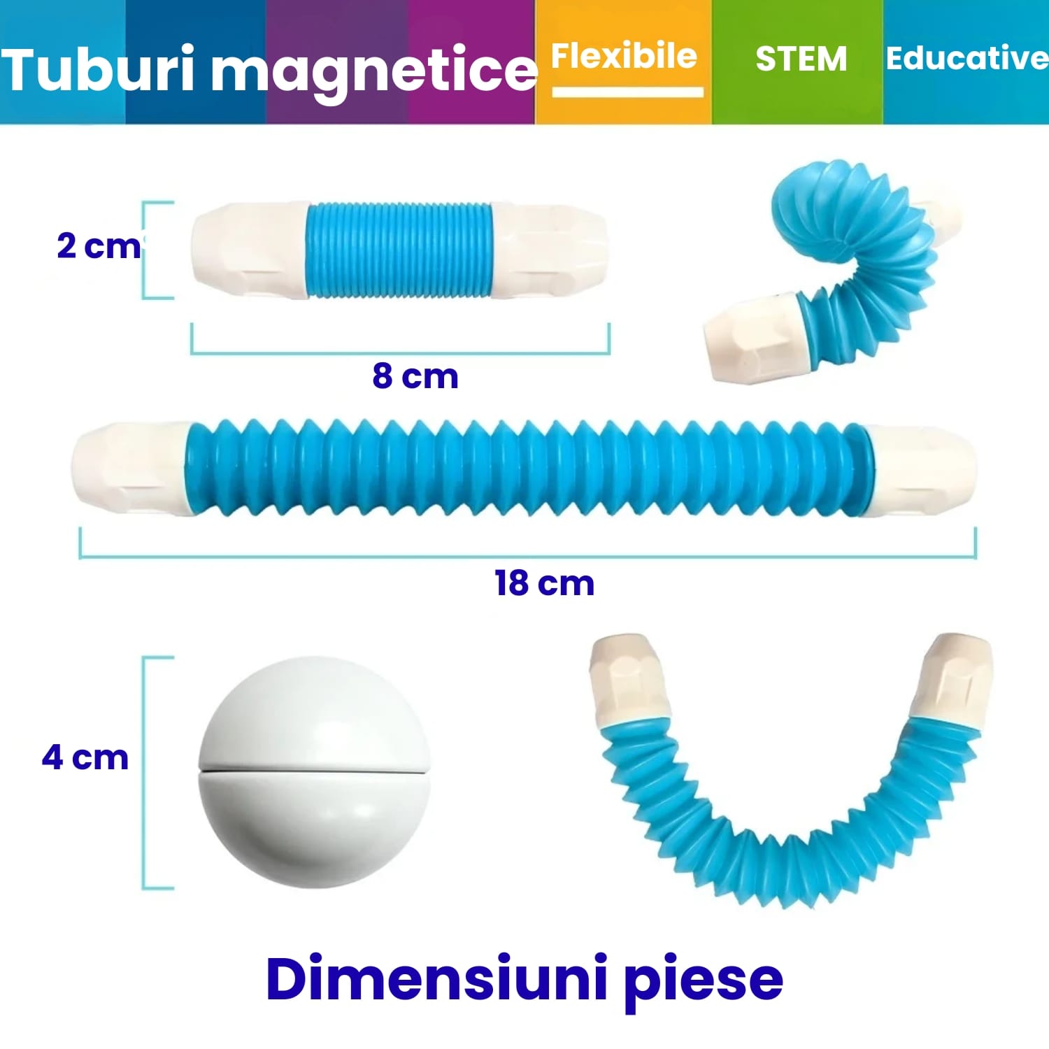 Setul include o combinație echilibrată de tuburi magnetice flexibile/telescopice (de diferite culori și lungimi de bază), tuburi curbate și bile magnetice metalice (noduri de conectare), asigurând o mare varietate de construcții.