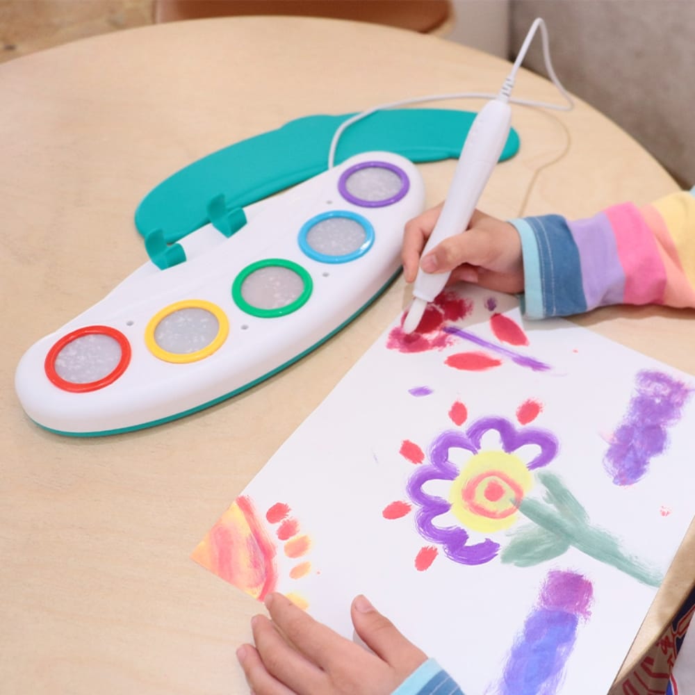 Copilul atinge cu vârful pensulei unul dintre cele 5 pad-uri de culoare (roșu, galben, verde, albastru, mov) de pe paleta interactivă.