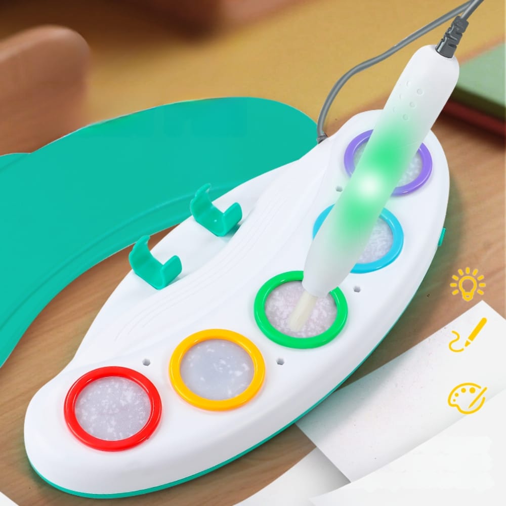 Nu necesită conectare la priză. Pensula este legată printr-un fir de paleta de culori (care servește drept bază de alimentare cu baterii). Acest design asigură mobilitate copilului, prevenind în același timp pierderea pensulei.