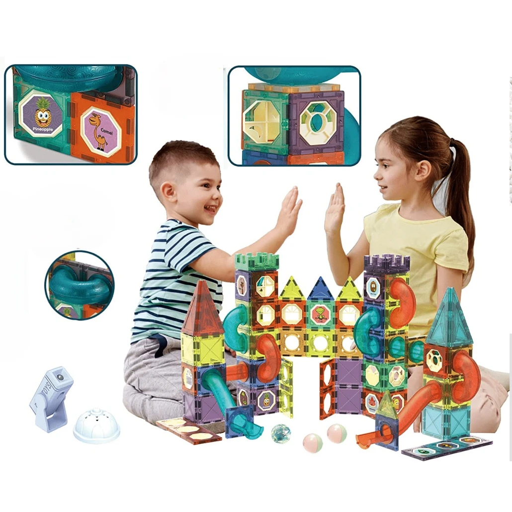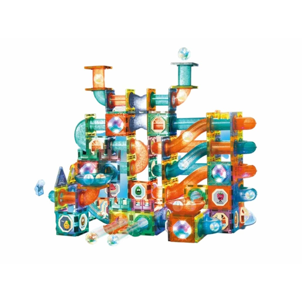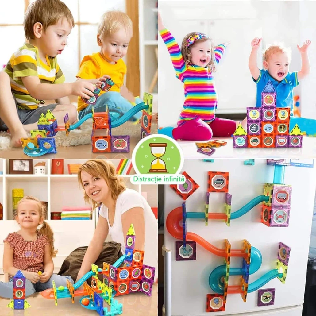 Copiii pot construi trasee complexe, tunele luminoase, turnuri magnetice, piste pentru bile. Fiecare structură poate fi recreată sau modificată după propria imaginație. Setul stimulează creativitatea și gândirea spațială prin joacă interactivă.