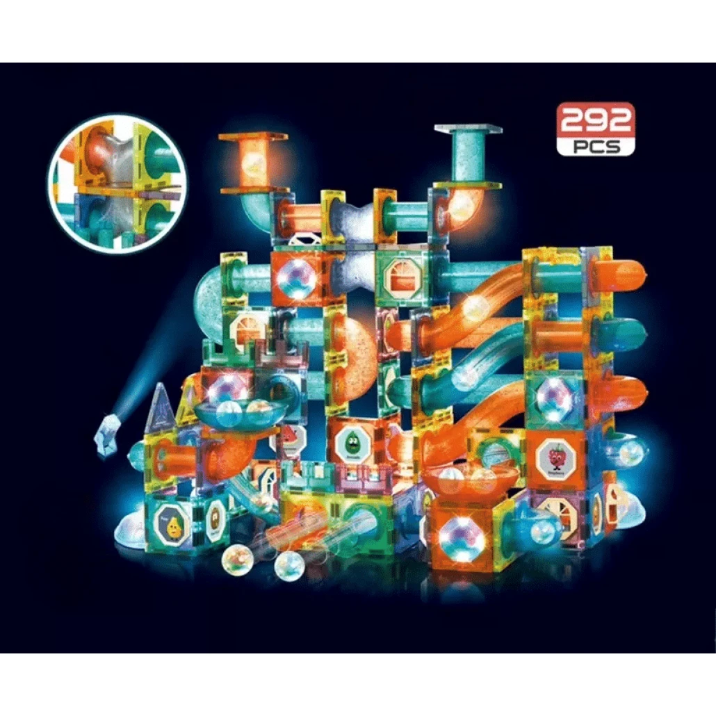 Set LUDIRO de construcție magnetică cu 292 piese: circuit cu bile LED, 2 figurine și blocuri modulare. Educativ, creativ și captivant pentru copiii de 3+ ani!