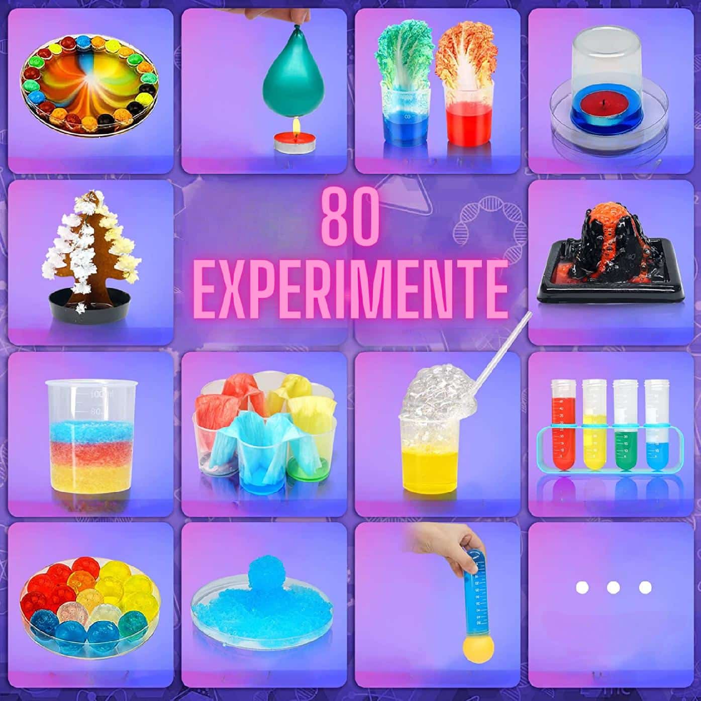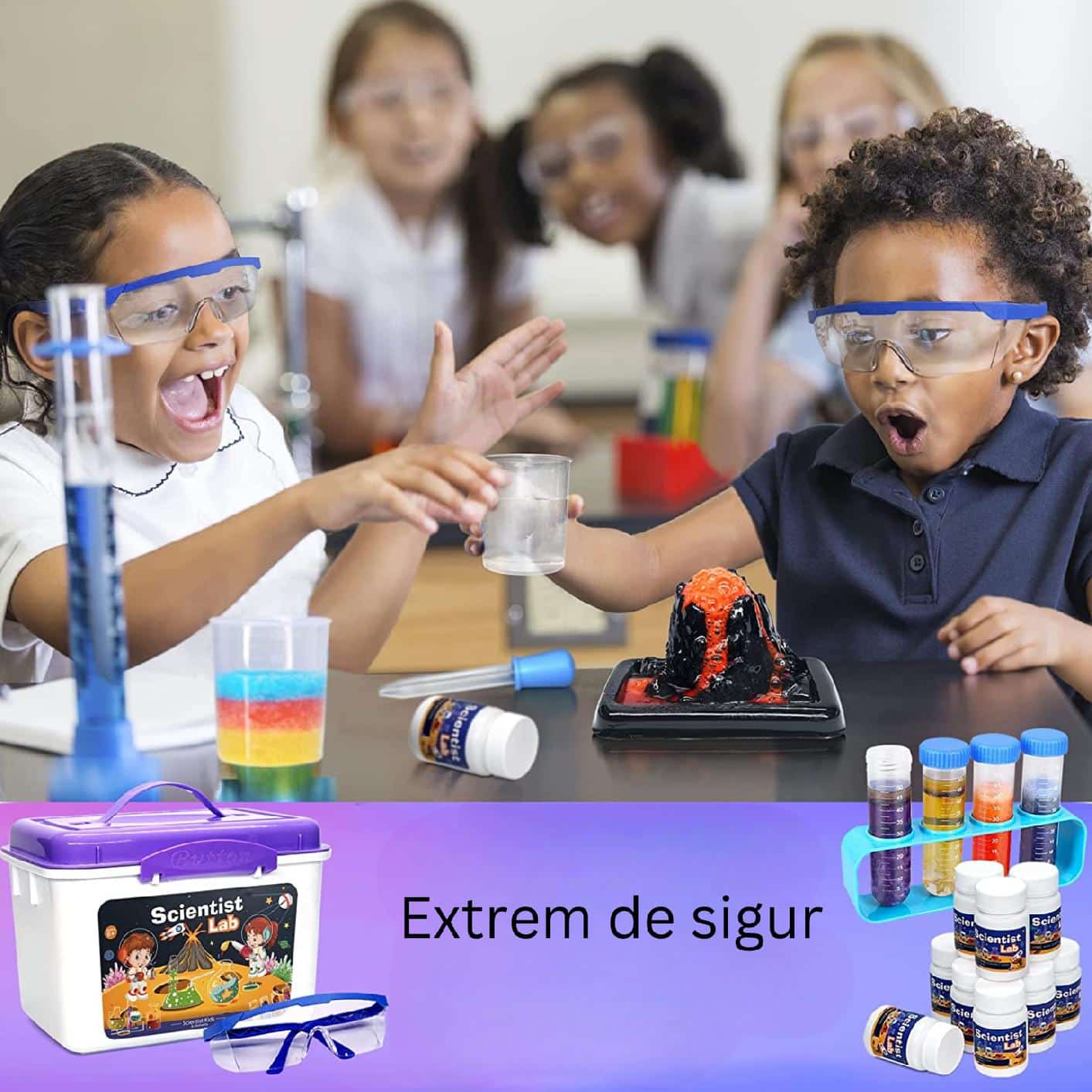 Set educativ tip laborator de stiinta STEM pentru copii 6+ ani, cu 80 de experimente si manual in limba romana. Include accesorii de laborator, cutie de depozitare si ochelari de protectie, pentru activitati practice acasa.