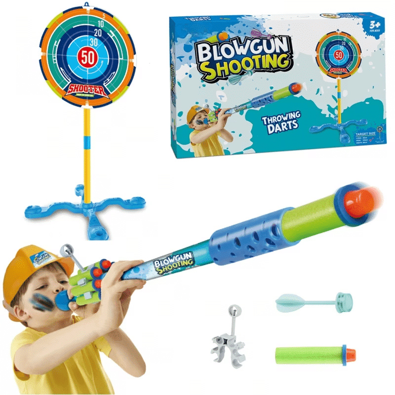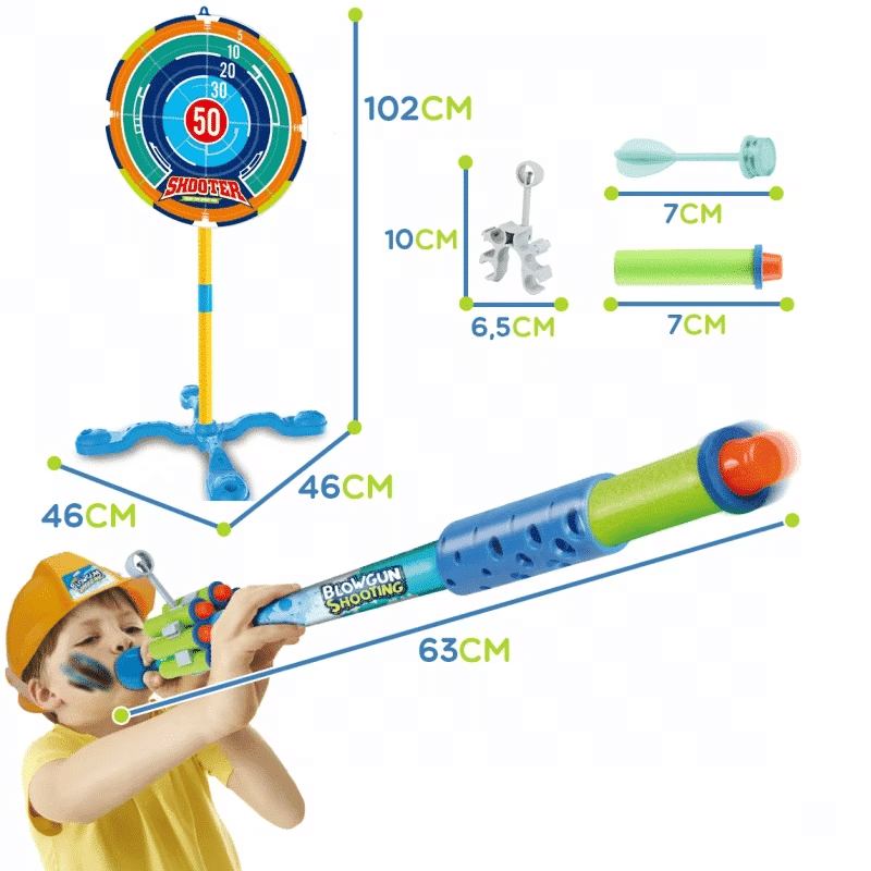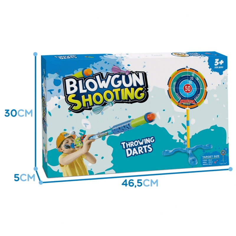 Lansatorul prin suflare este un joc in care trebuie sa lovim cat mai multe tinte special pregatite. Jocul este similar cu faimosul joc cu sageti. Distrati-va cu prietenii sau familia si obtineti cat mai multe puncte posibil. Setul include o suflanta imensa, colorata, cu mai multe tipuri de sageti. In plus, produsul are doua tinte, unul pentru agatat iar celalalt pentru punerea pe un suport cu auto-asamblare usoara.