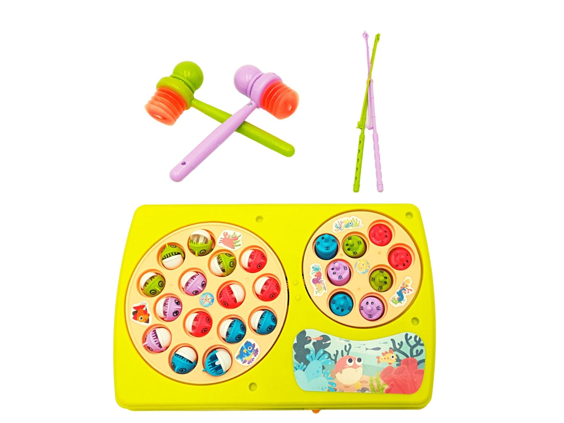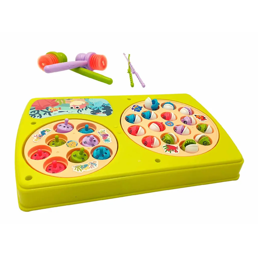 2 recenzii pentru Set Interactiv 2 in 1, Joc Pescuit cu 15 Pestisori si 2 Undite, Joc Whack A Mole cu 8 Cartite si 2 Ciocanele, Cadru Rotativ, Sunete, 28x18x4 Cm, Verde, + 3 Ani