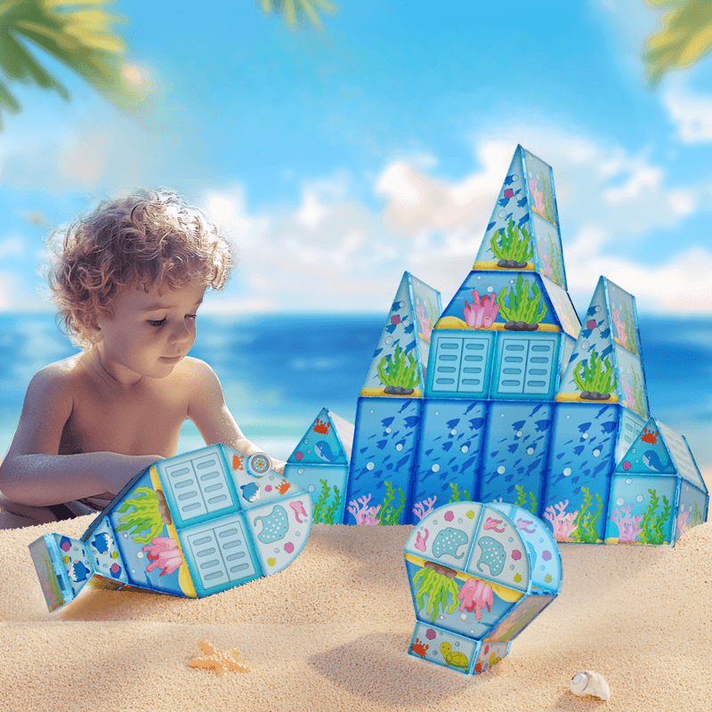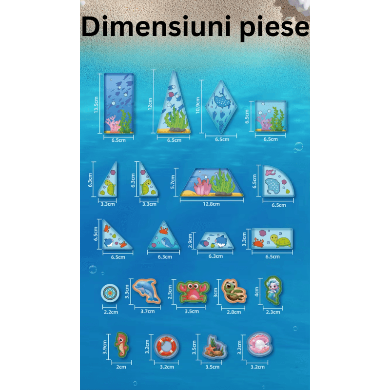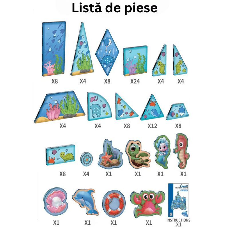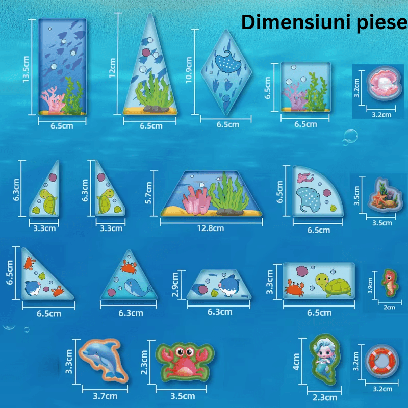 Setul este un ansamblu ingenios de piese magnetice cu design tematic oceanic, ce includ diverse forme geometrice, figuri ilustrative marine si accesorii decorative. Se adreseaza parintilor care cauta jucarii educative si creative pentru copiii lor, in special in primii ani de dezvoltare (3+), o perioada cruciala pentru stimularea inteligentei vizuale, spatiale si logice. Este un cadou perfect pentru fetite si baietei, un instrument educativ si recreativ in acelasi timp.