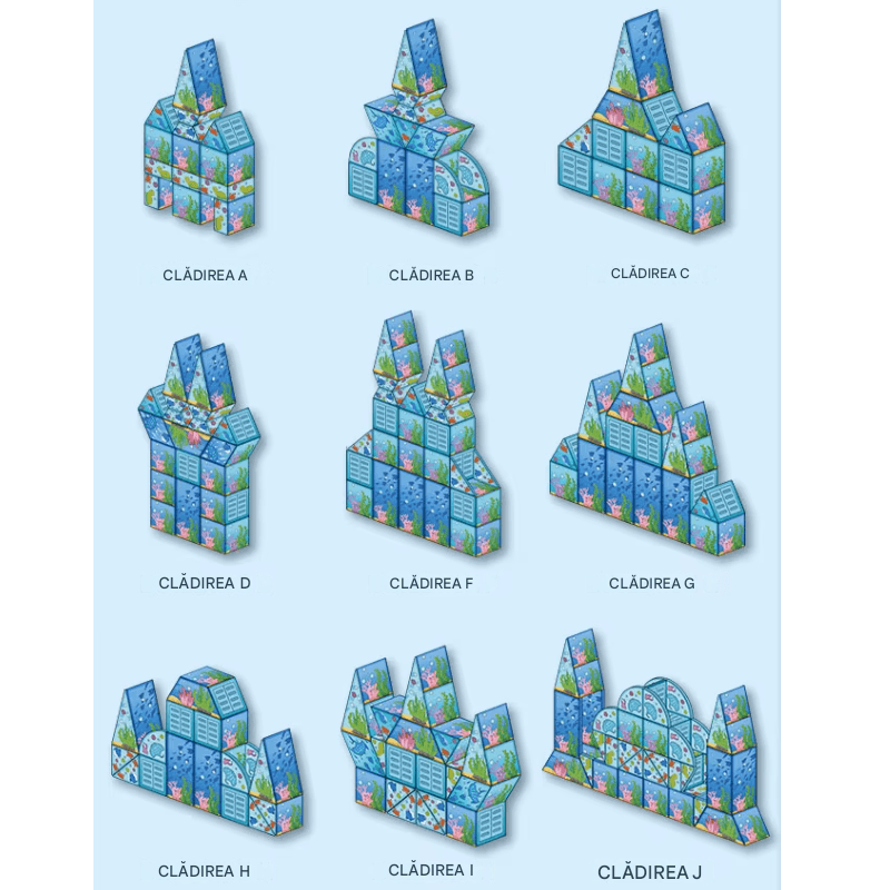 - Stimularea inteligentei spatiale: Asamblarea pieselor in structuri tridimensionale precum cladiri, stele de mare, submarine, faruri, dezvolta gandirea vizual-spatiala.