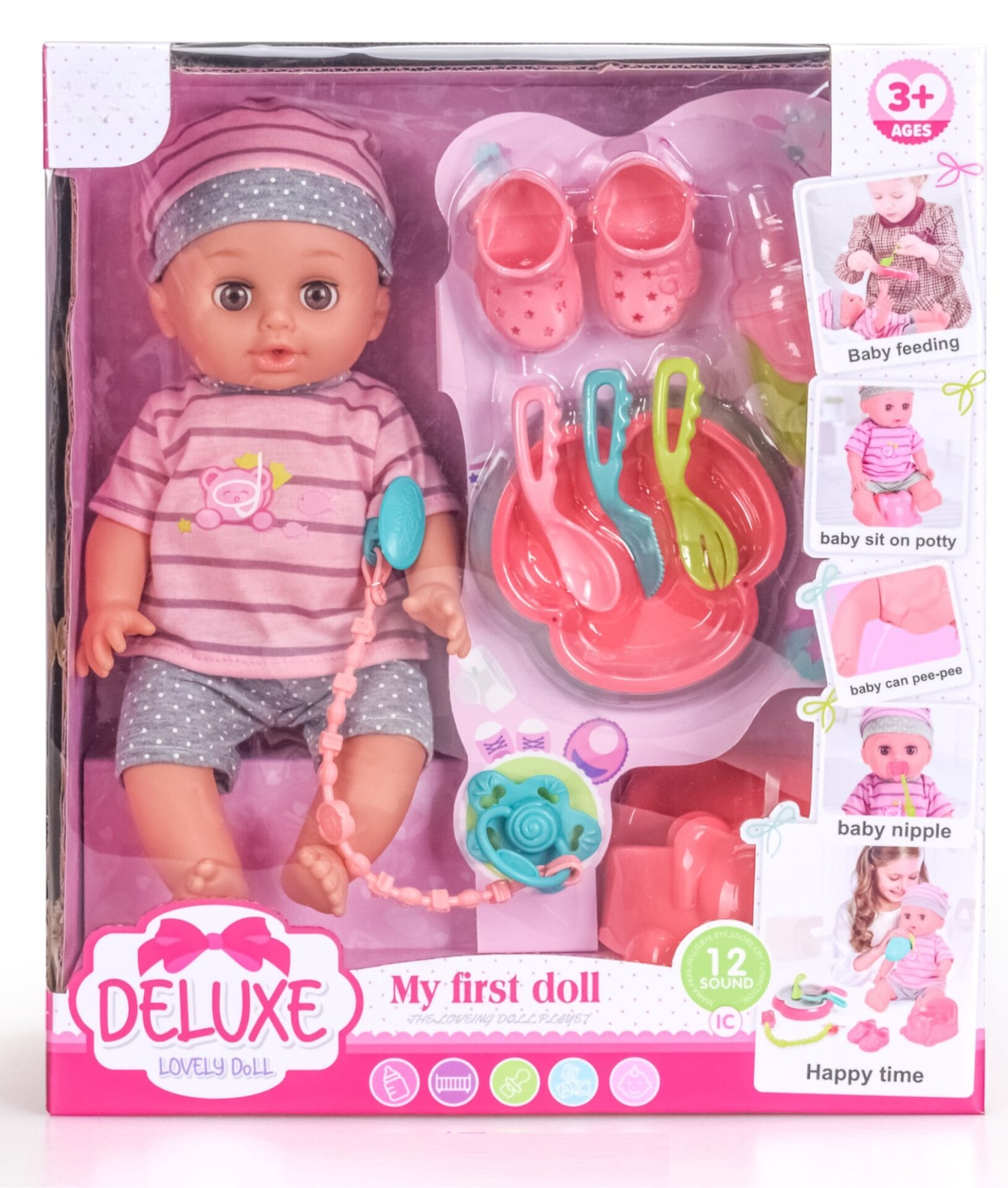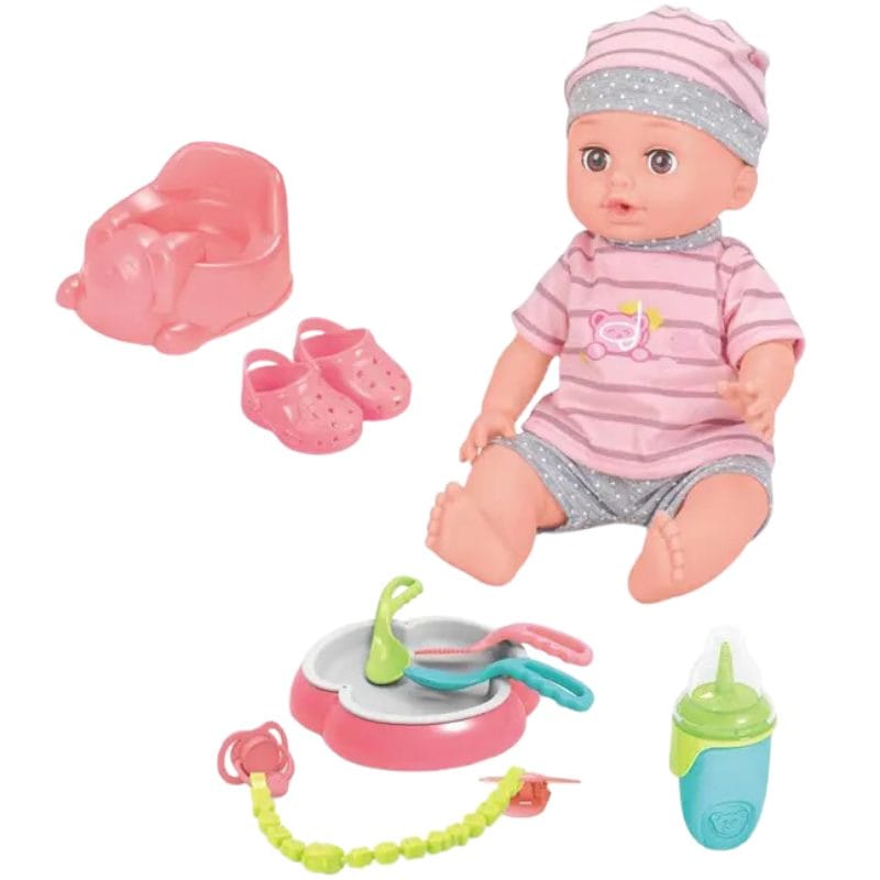 Acest set complex și bine gândit include o păpușă bebeluș de 30 cm cu funcții interactive multiple și o serie de accesorii atent alese pentru a stimula jocul de rol. Păpușa scoate 12 sunete realiste, poate fi hrănită cu biberonul, bea apă și apoi face pipi în oliță. Vine la pachet cu o suzetă, o farfurie cu tacâmuri, papucei și alte accesorii care transformă joaca într-o activitate realistă, captivantă și, mai ales, educativă.