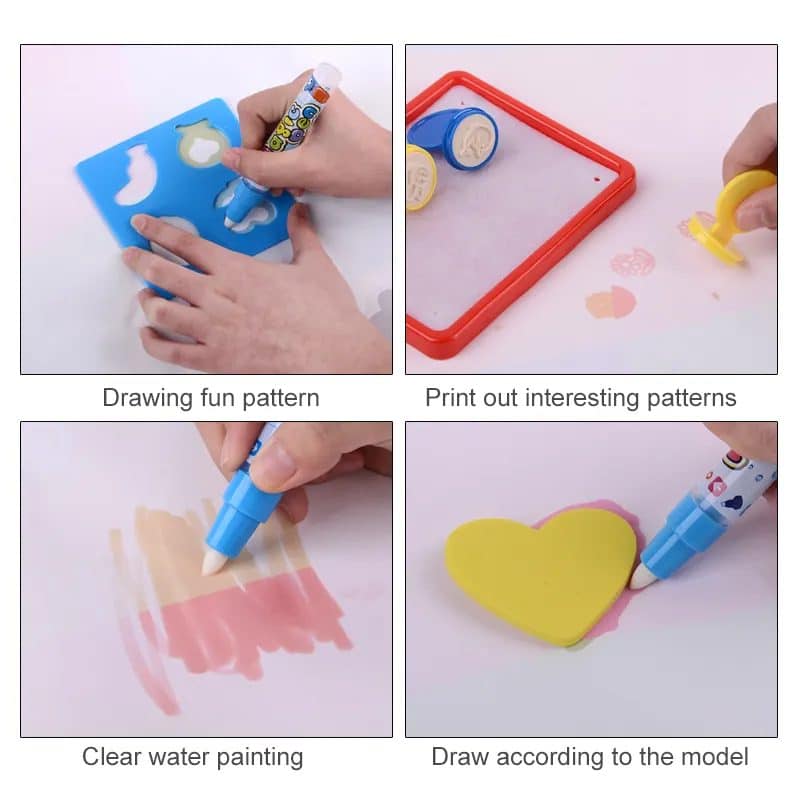 Covorasul, dupa ce l-a umezit cu apa, dezvaluie o imagine colorata. Datorita sablonului inclus in set, puteti desena diverse forme pe suprafata acestuia. In plus, exista stampile care pot fi imprimate pe suprafata dupa inmuiere cu apa.