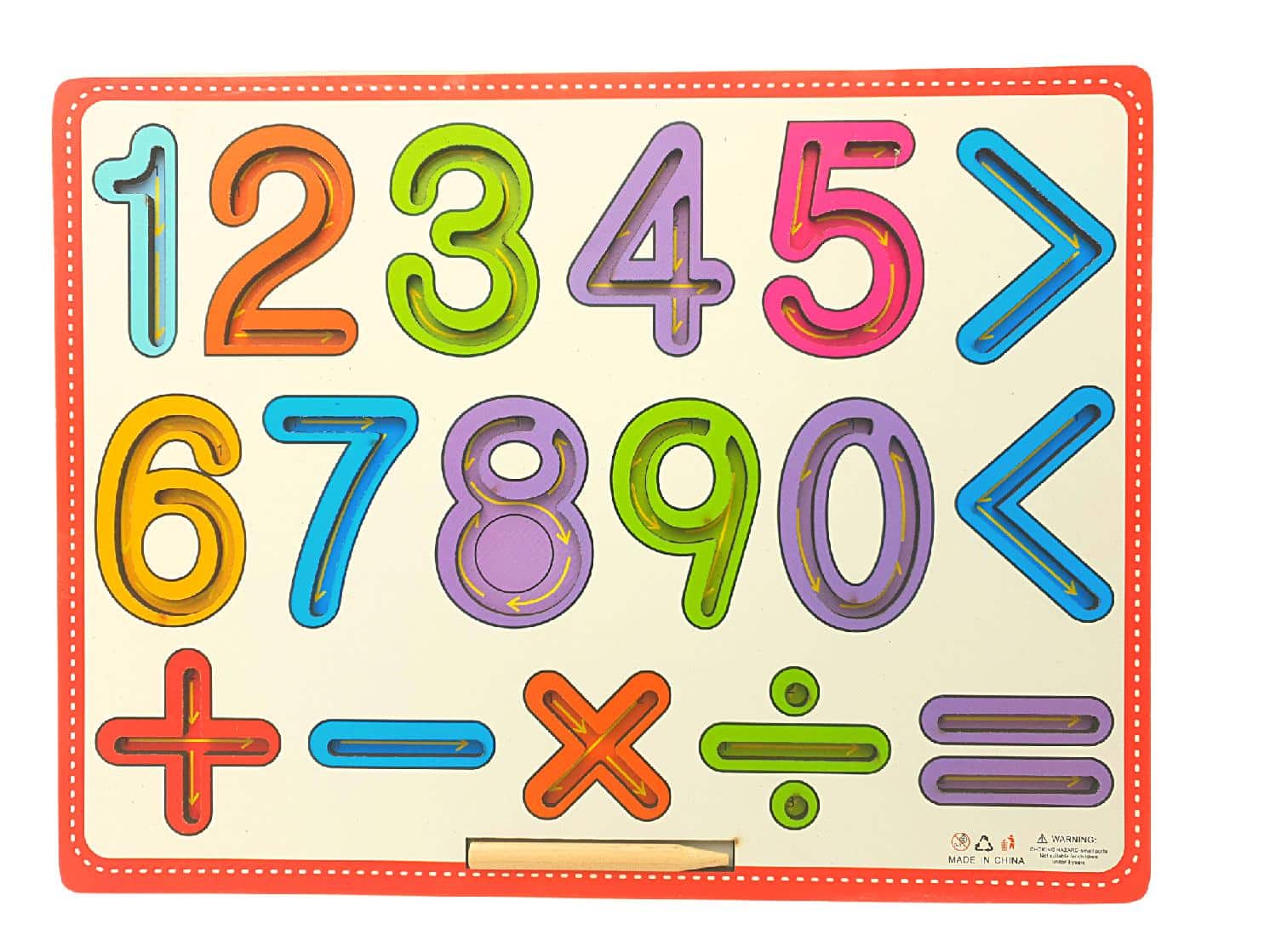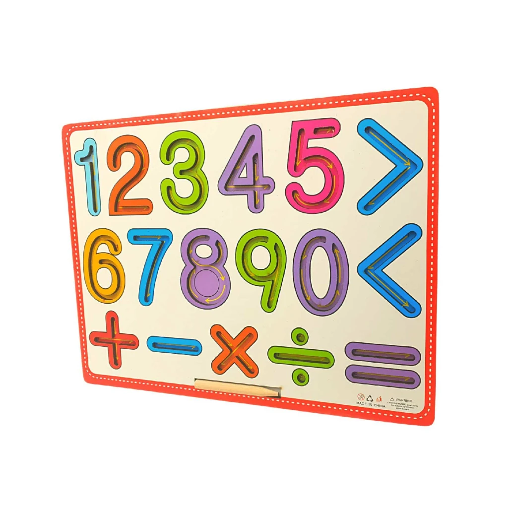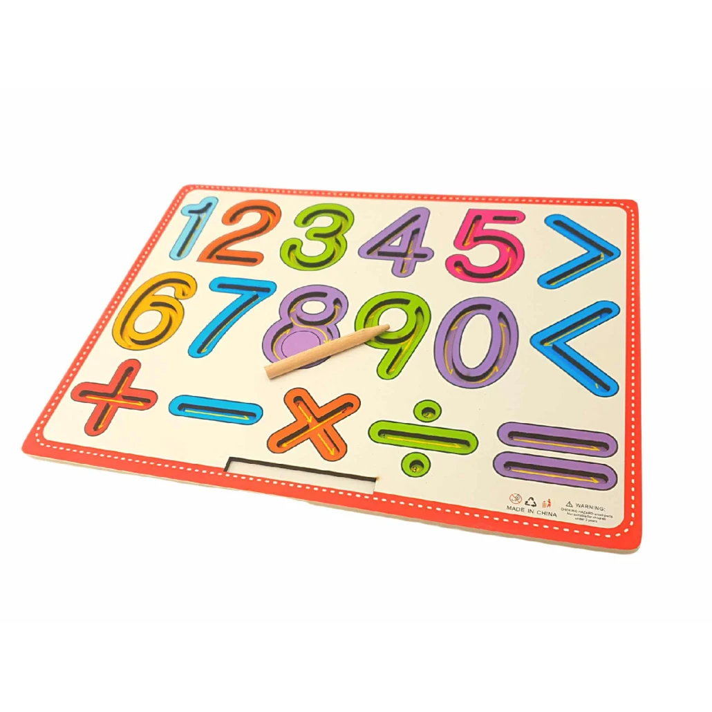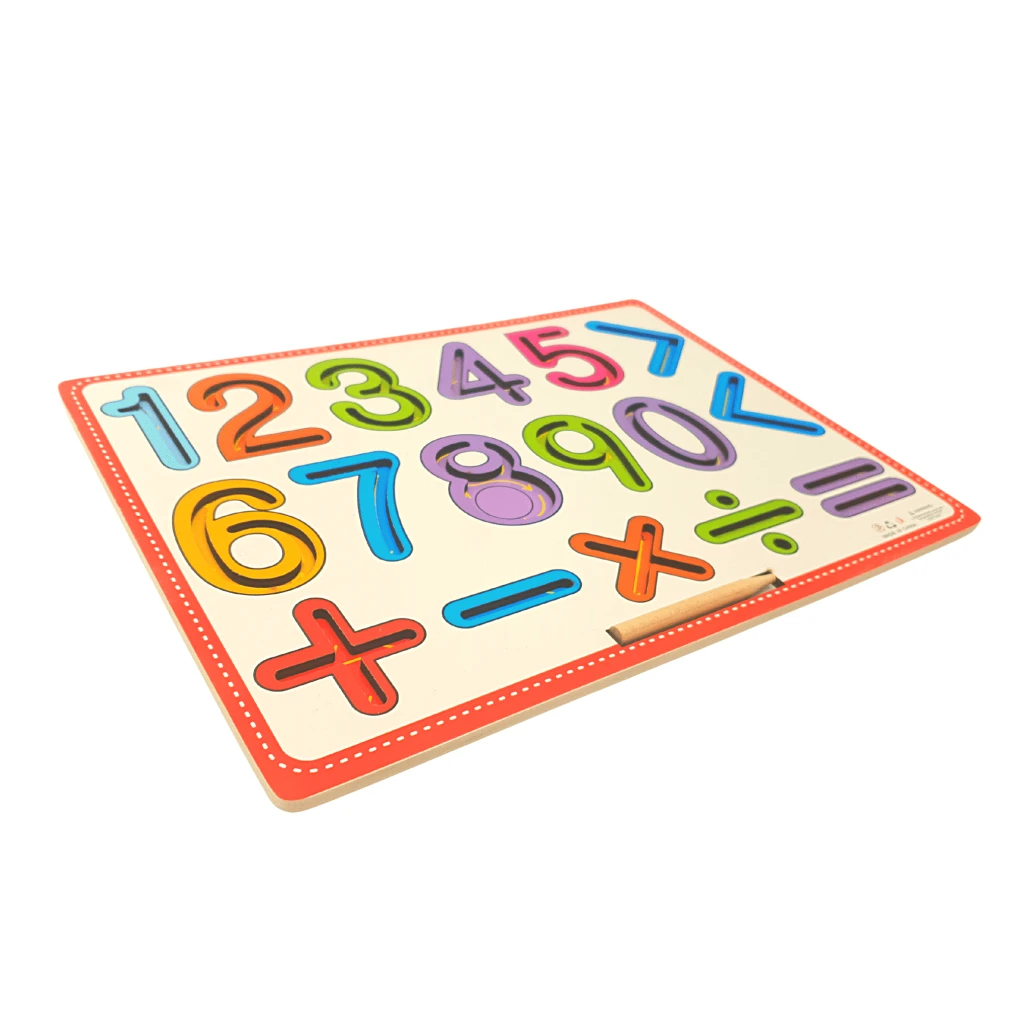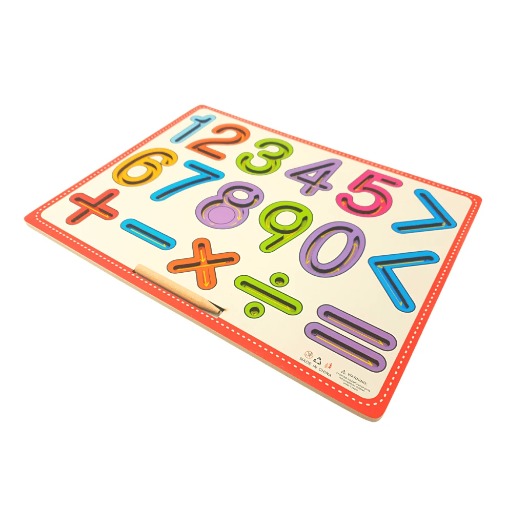 Aceasta tabla din lemn educativa cuprinde cifrele de la 1 la 9 si semnele de adunare, scadere, inmultire, impartire, egal, mai mare si mai mic. Toate acestea sunt sculptate in table si folosind creionul din dotare, copilul poate deprinde miscarile necesare pentru a invata sa scrie semnele respective.