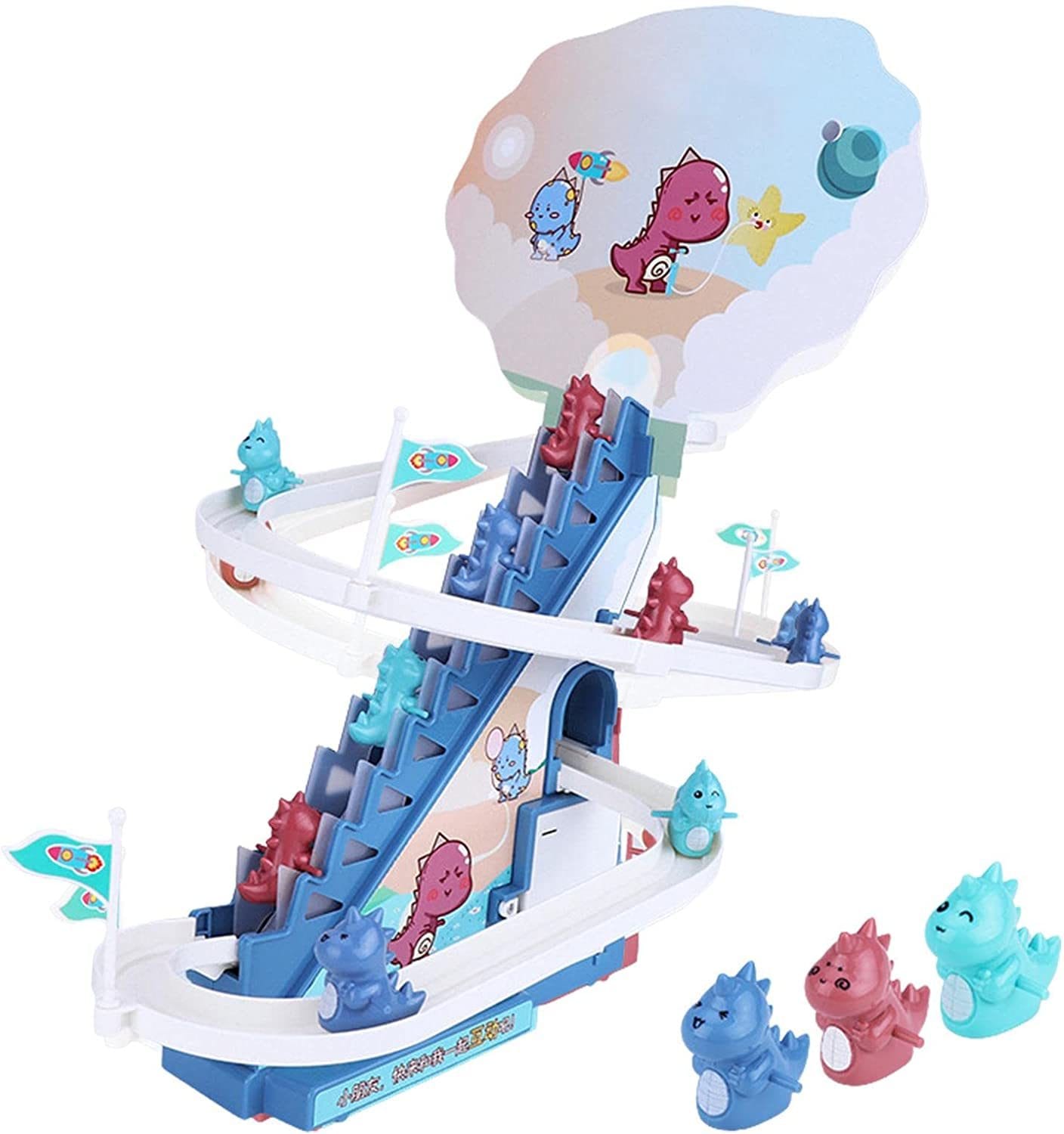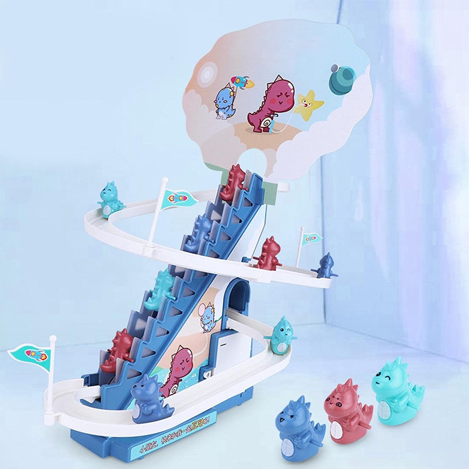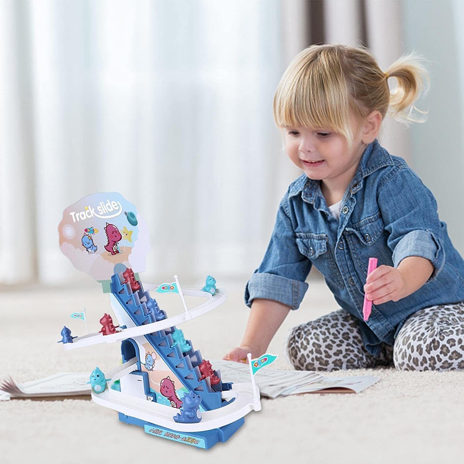 Produsul vine cu lumini LED intermitente, usor de asamblat, cu surubelnita inlusa, pista draguta de alunecare a dinozaurului pe scari, piese interesante si muzica vesela (cu butoane pornit/oprit).