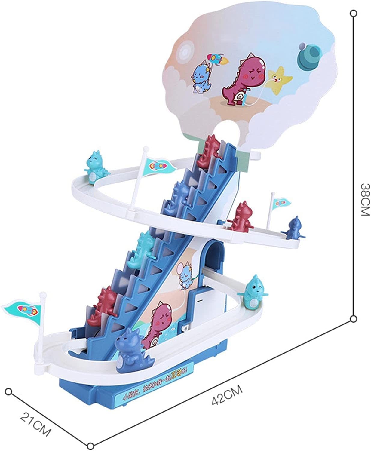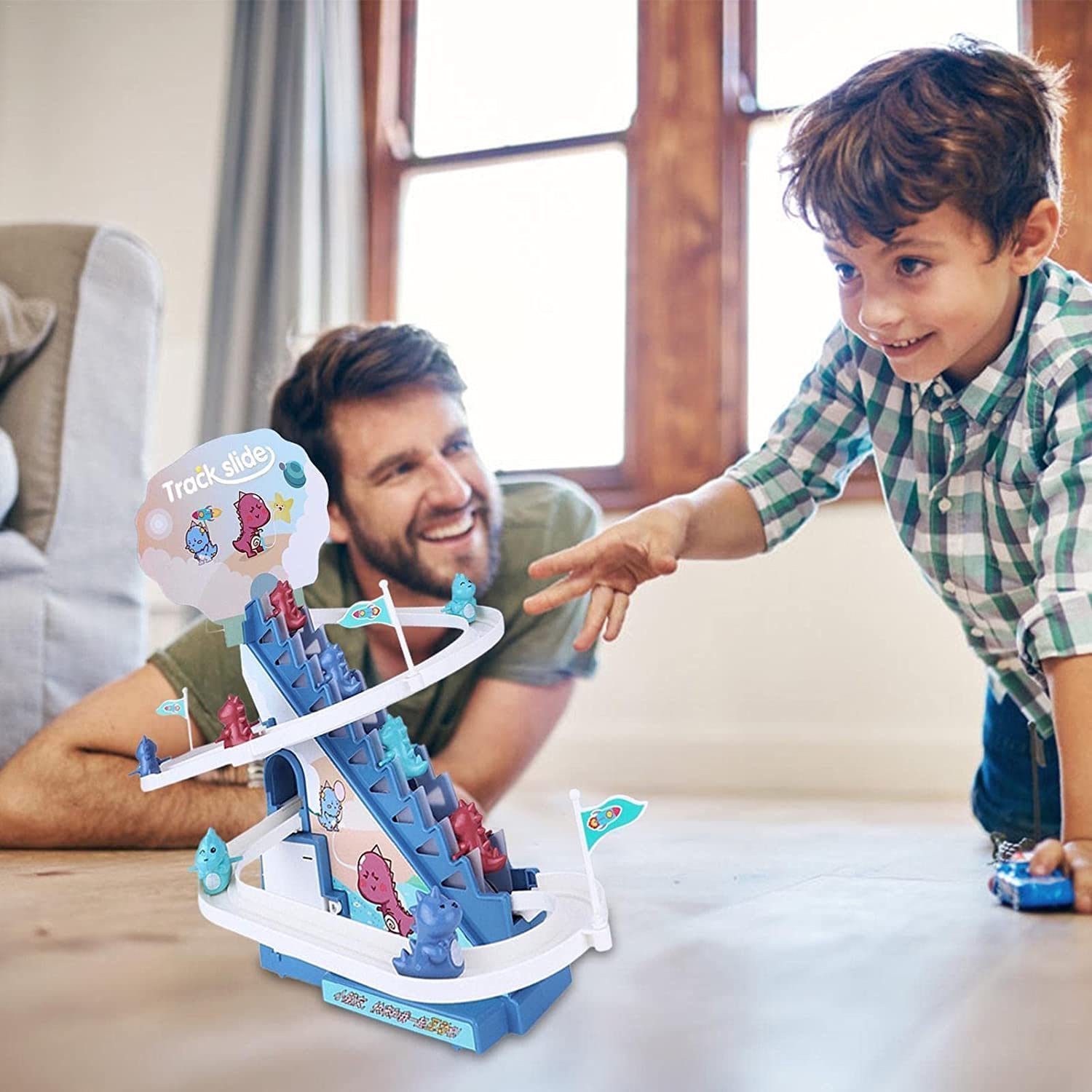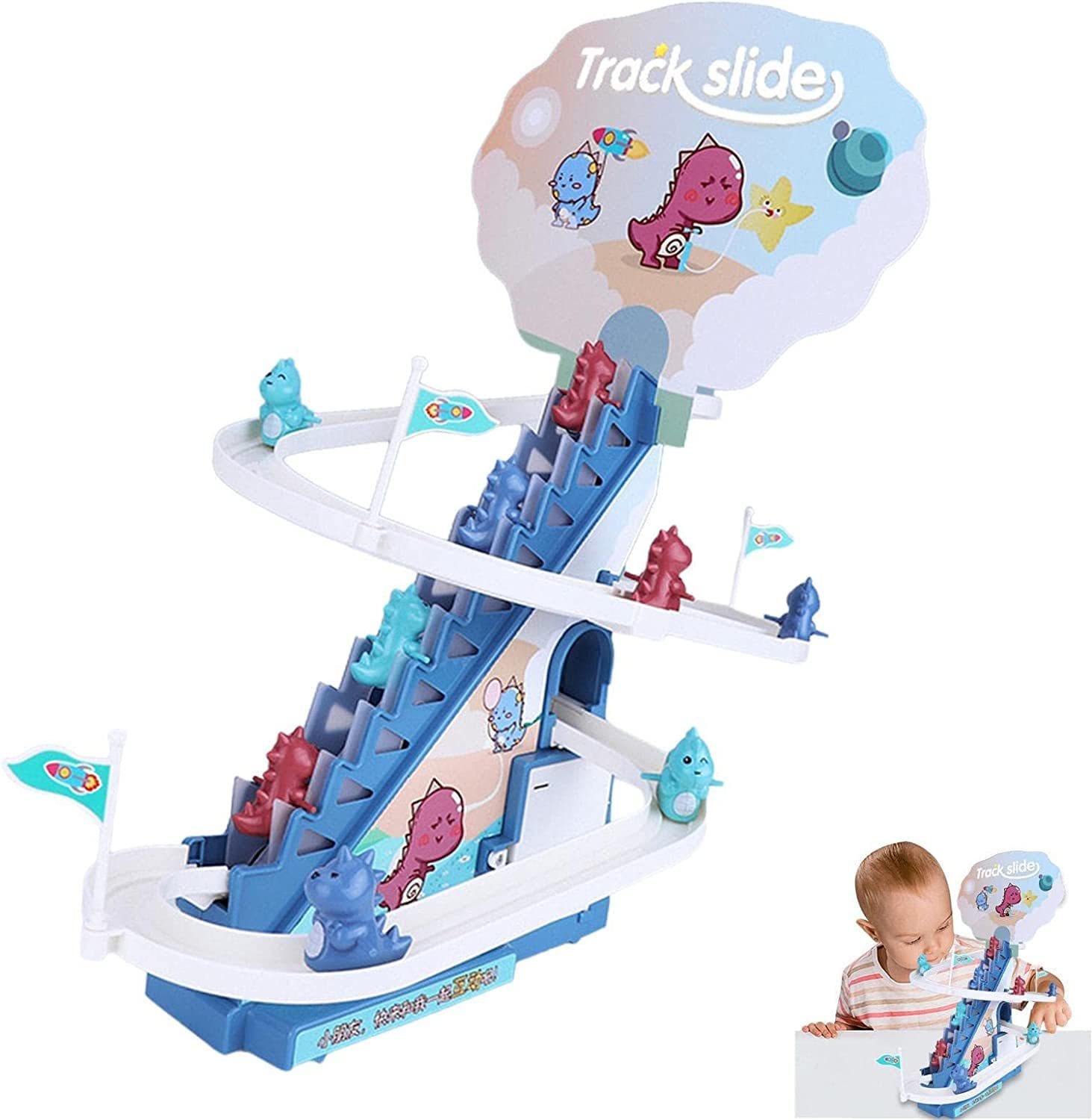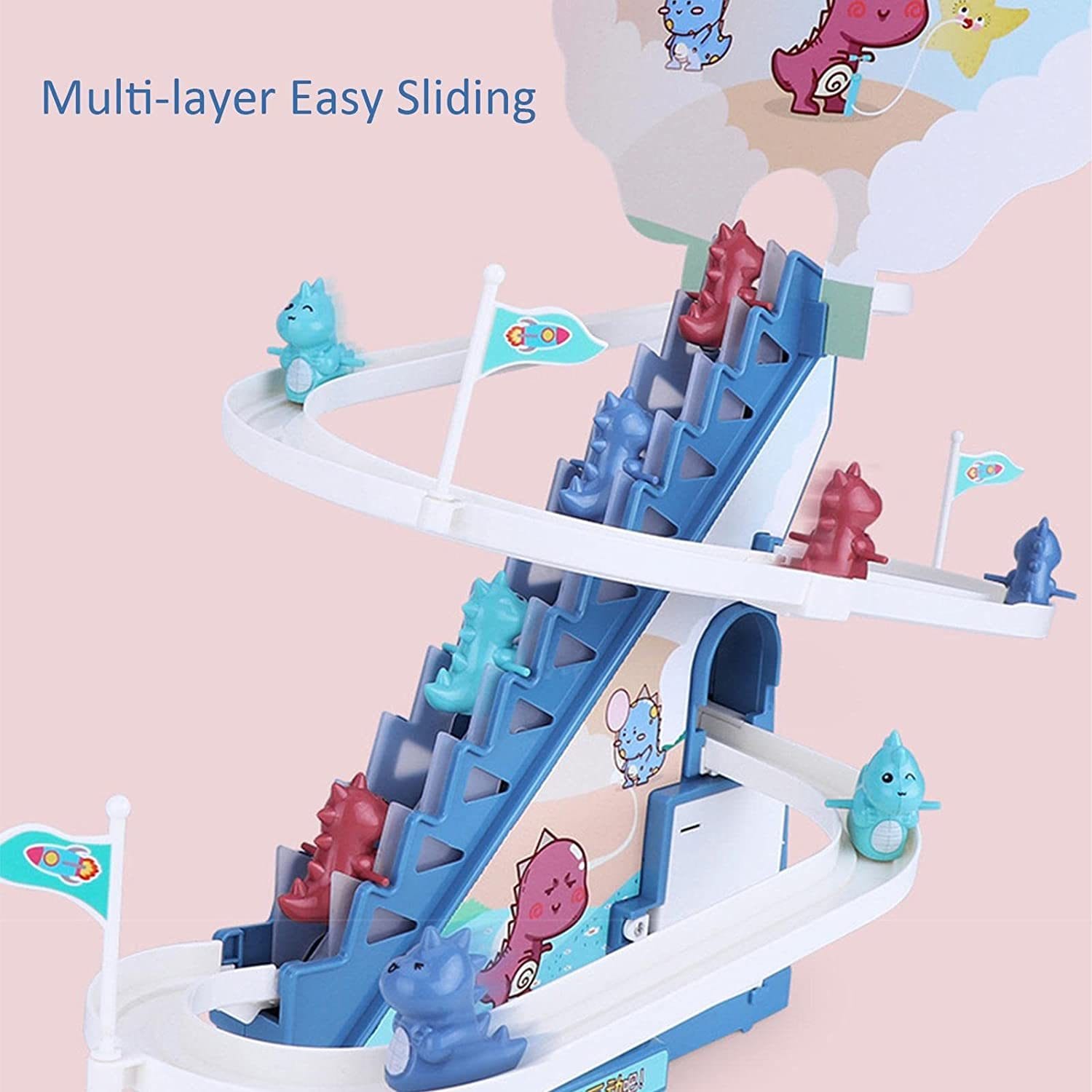 Produsul vine cu lumini LED intermitente, usor de asamblat, cu surubelnita inlusa, pista draguta de alunecare a dinozaurului pe scari, piese interesante si muzica vesela (cu butoane pornit/oprit).