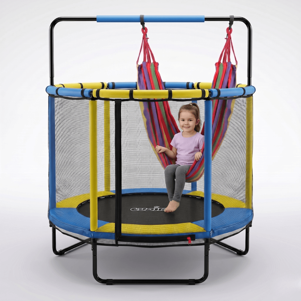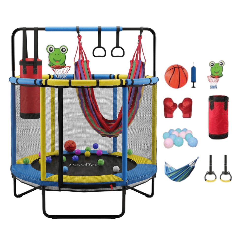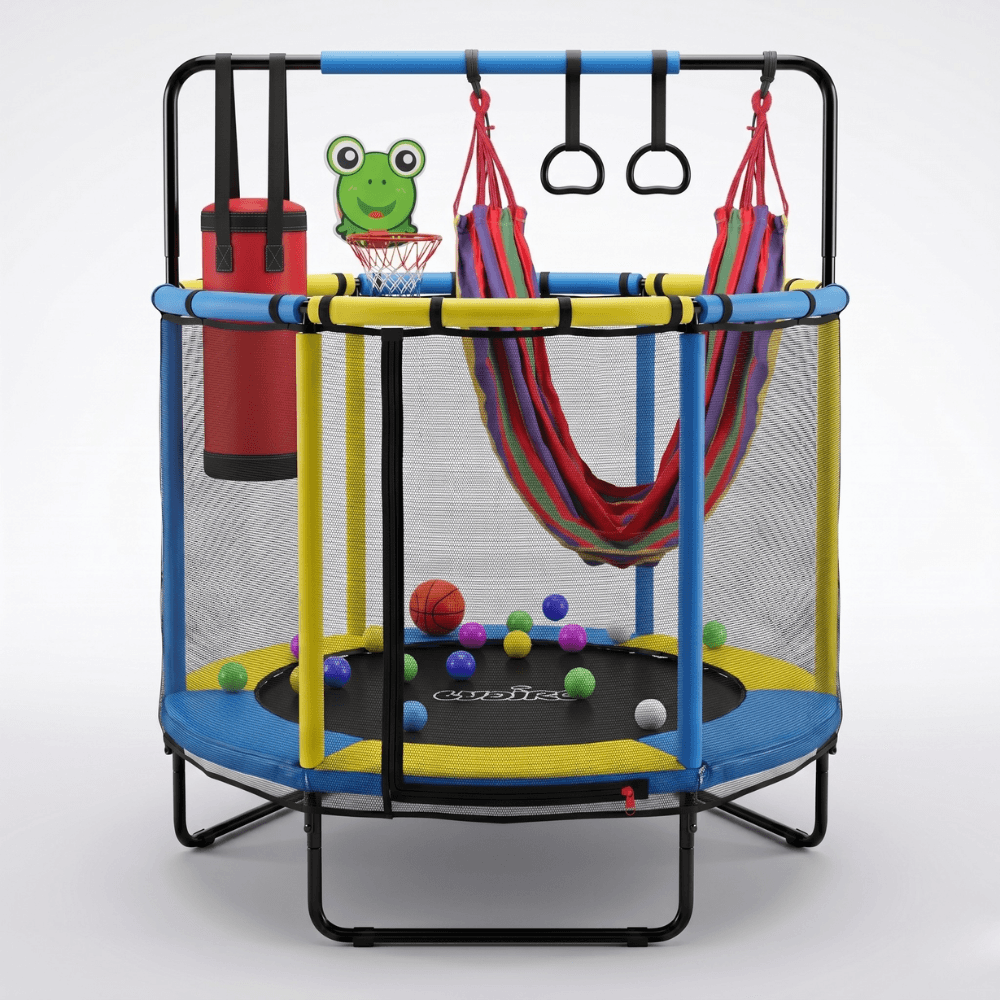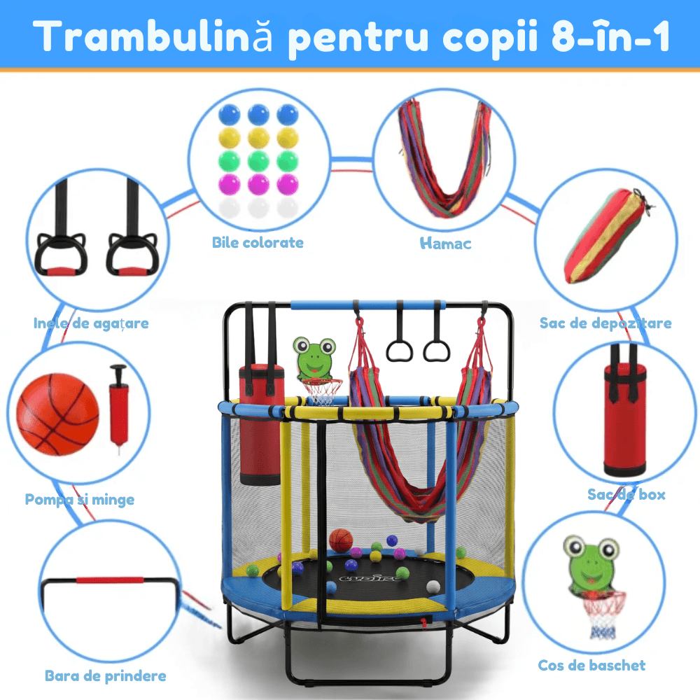 Nu este doar o trambulină clasică, ci un centru de joacă multifuncțional 8 în 1. Copilul poate să sară, să se relaxeze în hamac, să exerseze coordonarea cu inelele, să se joace la coșul de baschet sau să consume energia într-un mod activ și plăcut.