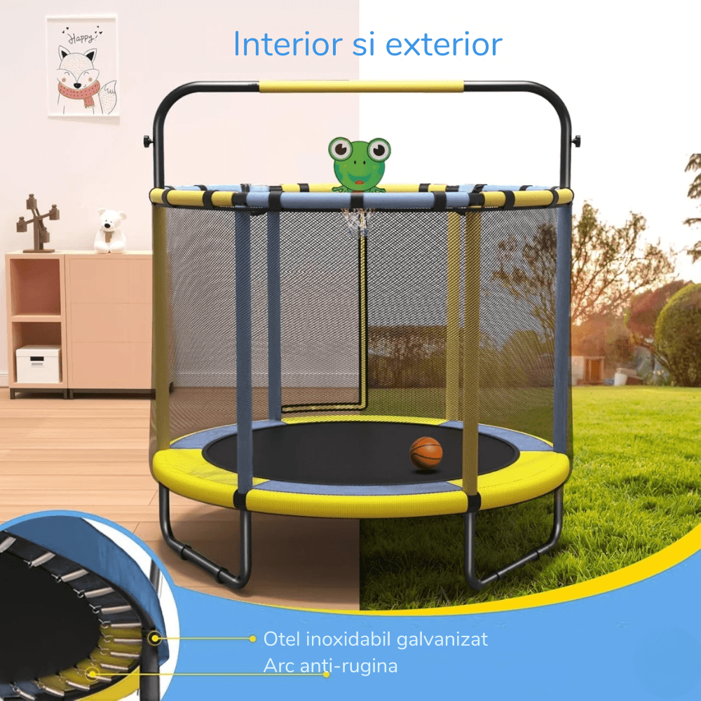 Trambulina este construită cu accent pe protecție și stabilitate. Plasa de siguranță ajută la limitarea ieșirii accidentale din zona de joacă, iar barele sunt acoperite pentru a reduce contactul direct cu structura metalică.