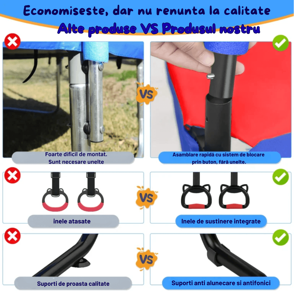 Această trambulină pentru copii 8 în 1 este alegerea potrivită pentru părinții care își doresc un produs complet, atractiv și util pentru consumul de energie al celor mici. Față de o trambulină clasică, acest model adaugă mai multe opțiuni de joacă și mișcare, ceea ce îl face mai interesant și mai valoros pentru utilizare zilnică.