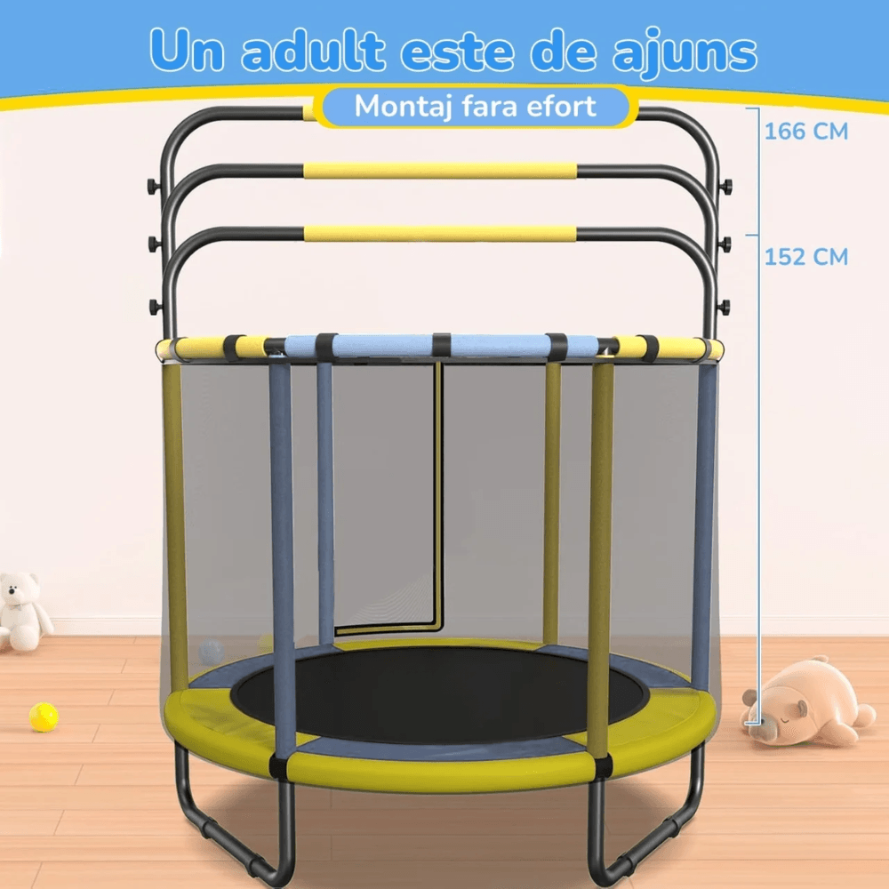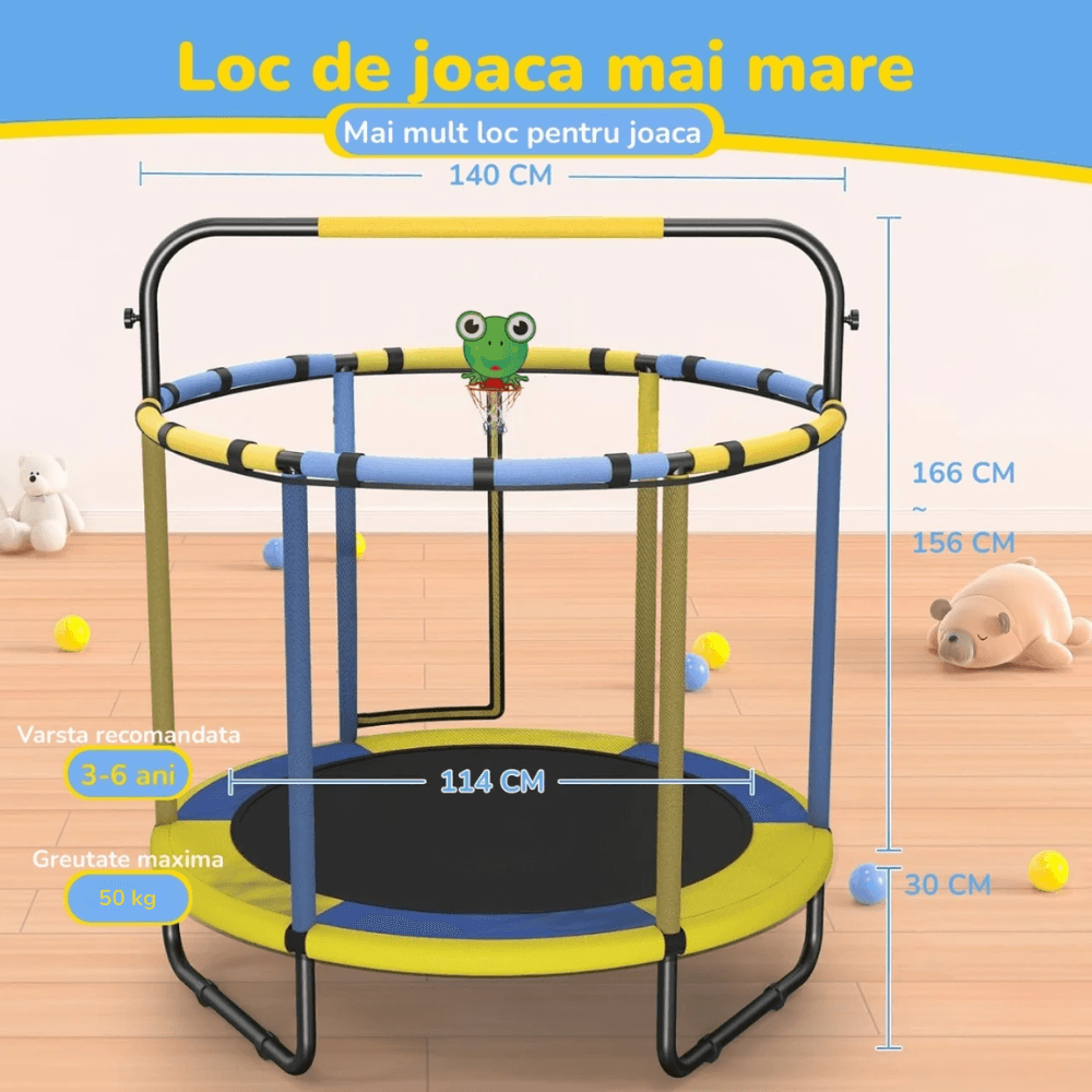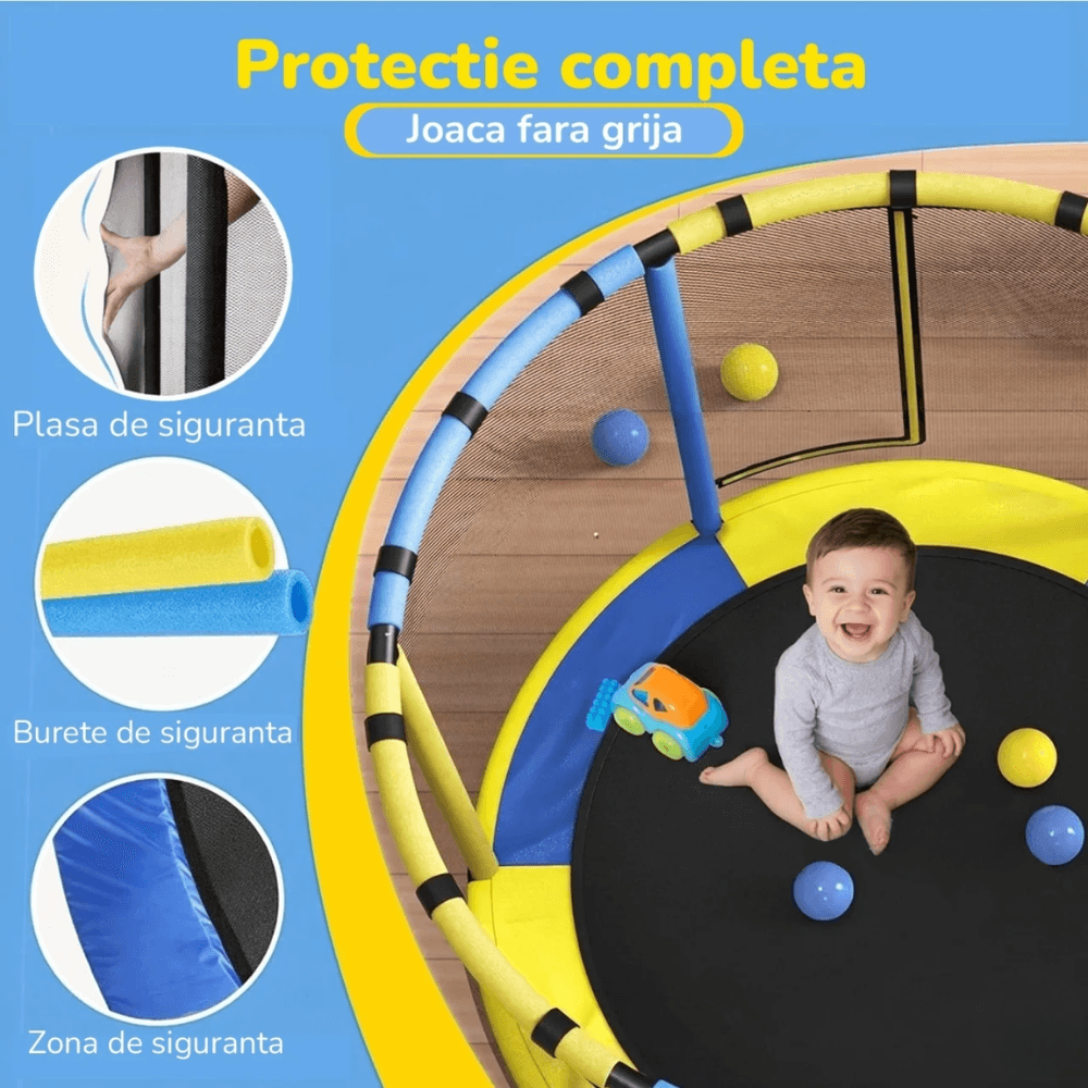 Modelul este prevăzut cu plasă de siguranță, bureți de protecție pe bare și zonă de protecție perimetrală, pentru o experiență de joacă mai bine controlată. Aceste detalii sunt esențiale pentru părinții care caută o trambulină sigură pentru copii.