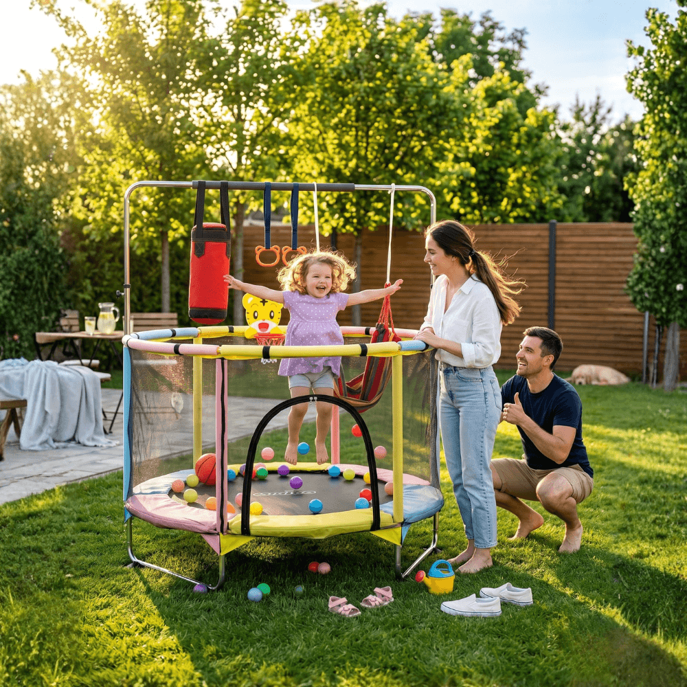 Imaginează-ți o după-amiazǎ în care cel mic sare, aruncǎ la coș, se leagǎnǎ în hamac și descopere lumea prin joacǎ — totul într-un singur loc sigur și colorat. Trambulina pentru Copii 6-in-1 de la LUDIRO transformǎ orice camerǎ sau terasǎ într-un mic parc de distracții, gândit special pentru copiii între 1 și 6 ani. Șase activitǎți, zero plictisealǎ.