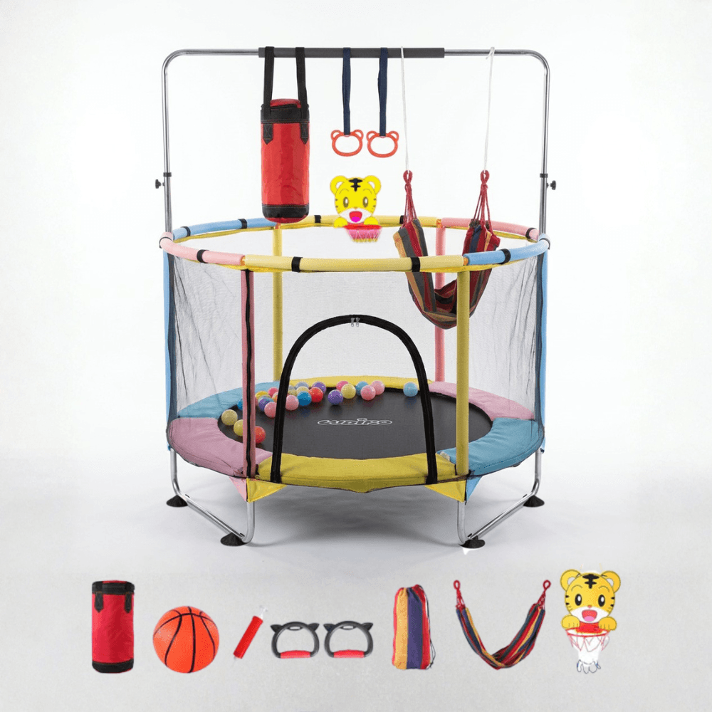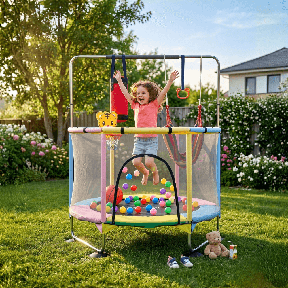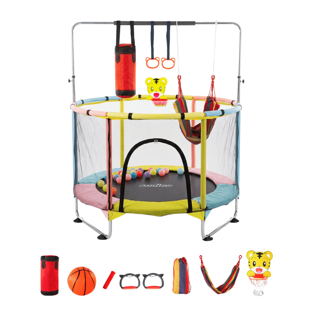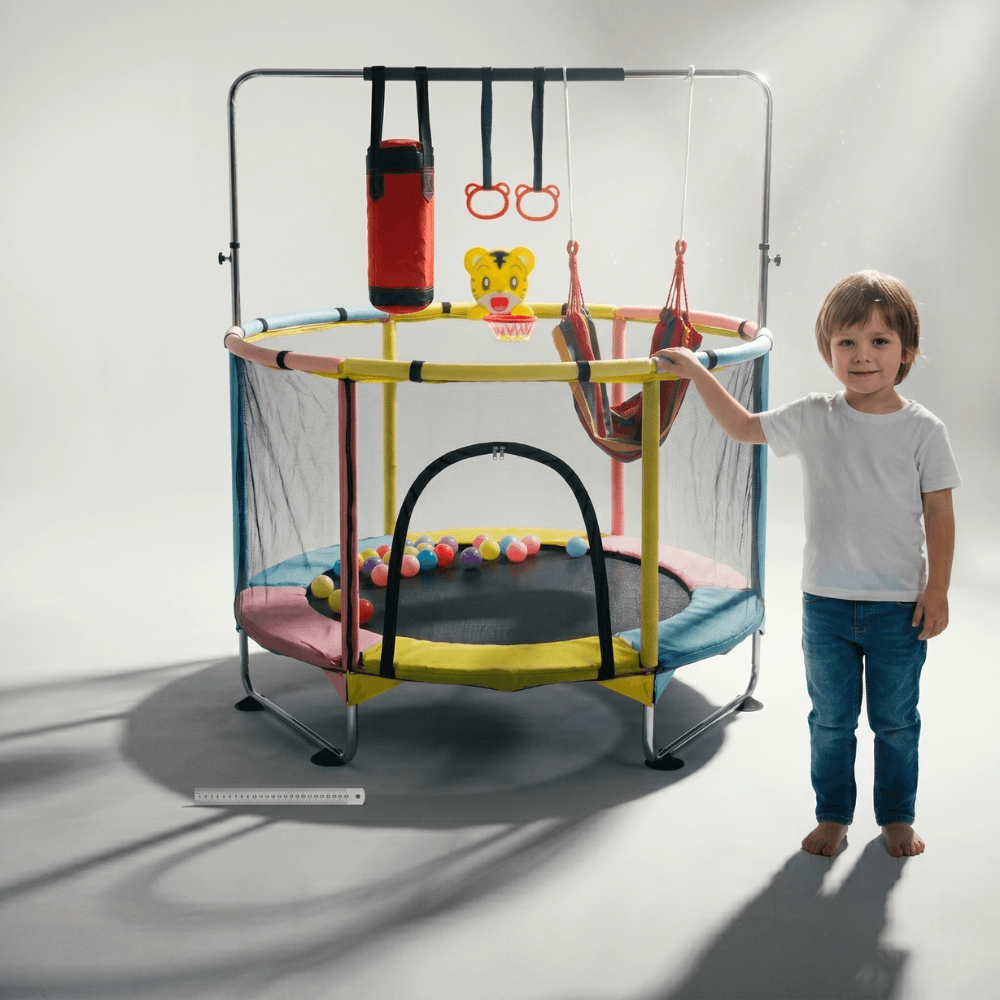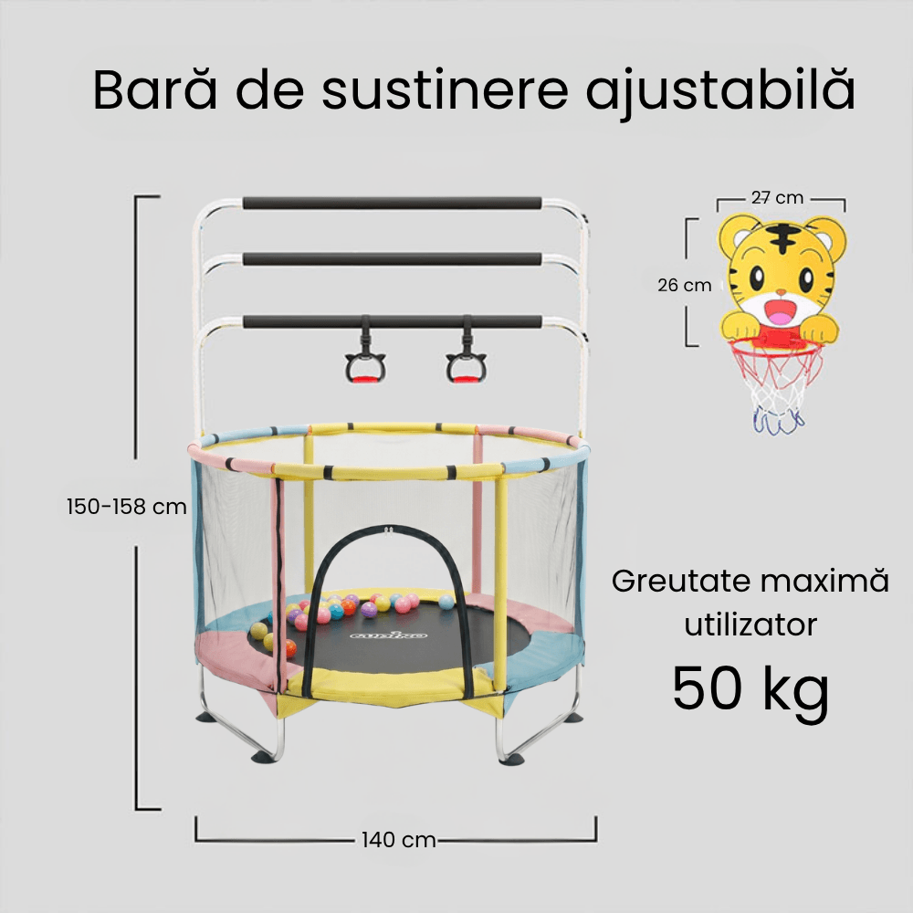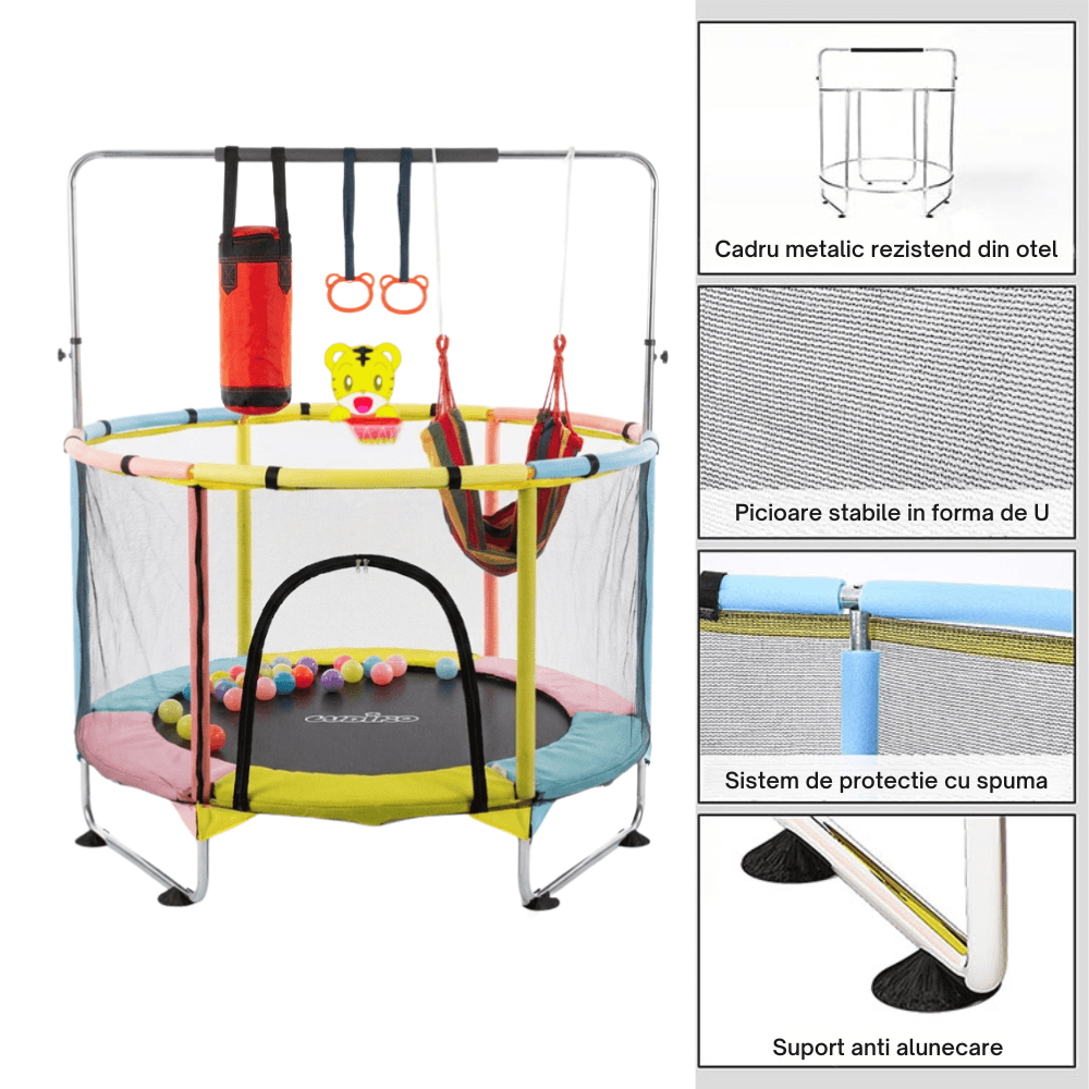 🎯 6 ACTIVITǍȚI ÎNTR-UN SINGUR LOC — Trambulinǎ cu saltea de sǎrit, sac de box, inele de gimnasticǎ, coș de baschet cu design de tigru, hamac colorat și bile colorate incluse. Fiecare zi aduce o nouǎ aventurǎ.