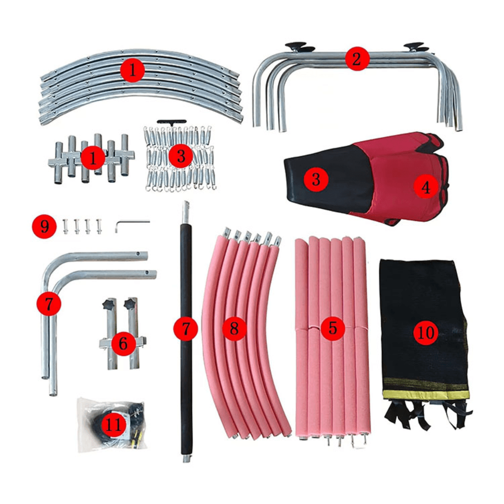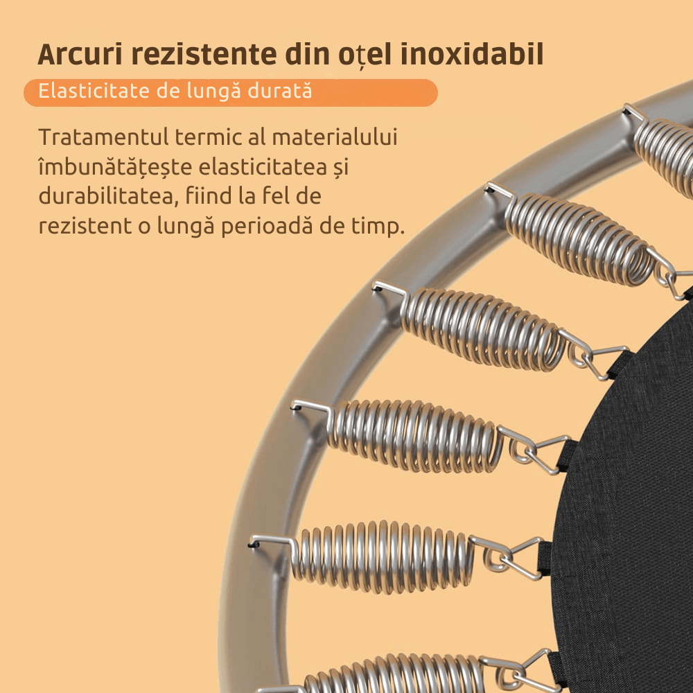 ⭐ 30 ARCURI DIN OȚEL INOXIDABIL — Tratament termic pentru elasticitate de lungǎ duratǎ. Revenire rapidǎ și sǎrituri line, prietenoase cu articulațiile celor mici. Toate arcurile sunt acoperite de padding-ul de protecție.