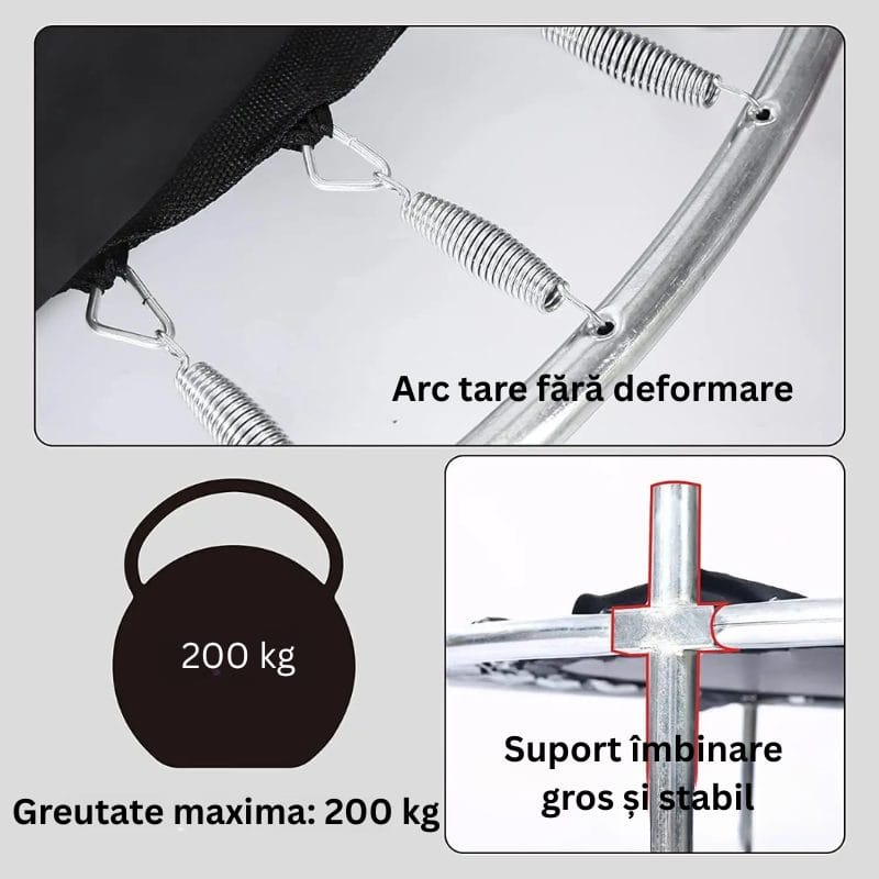 Materialul elastic si rezistent al suprafetei de sarituri, impreuna cu arcurile de inalta tensiune, asigura o experienta de sarit lina, sigura si confortabila.