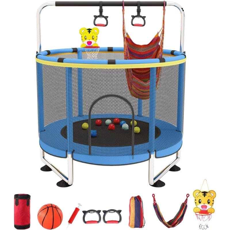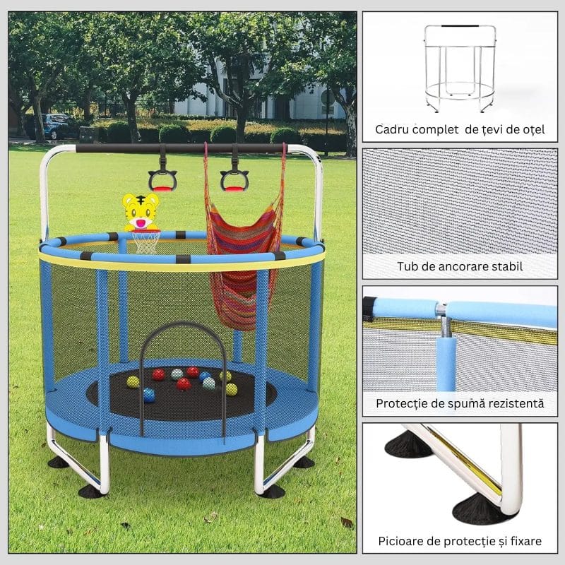 Trambulina pentru Copii LUDIRO, Diametru 140 Cm, Cu Plasa de Siguranta, Cos Baschet, Leagan Si Accesorii, Suporta 200 kg, Interior sau Exterior, Pentru Dezvoltarea Echilibrului, Albastra, + 3 Ani