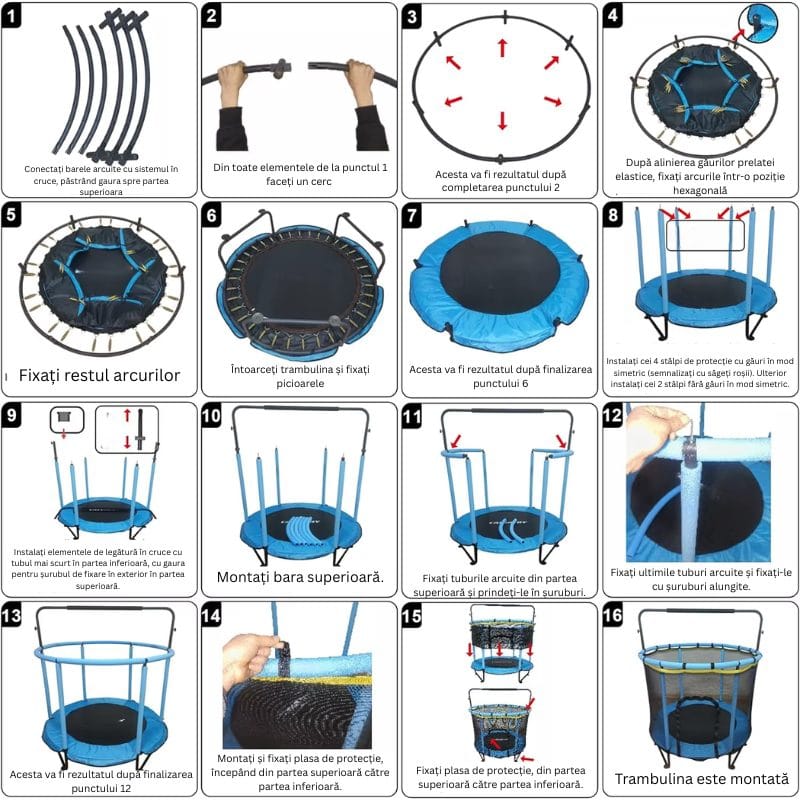 Pachetul include toate componentele necesare si un ghid ilustrat pas cu pas. Instalarea trambulinei este simpla si nu necesita unelte speciale sau abilitati tehnice avansate.