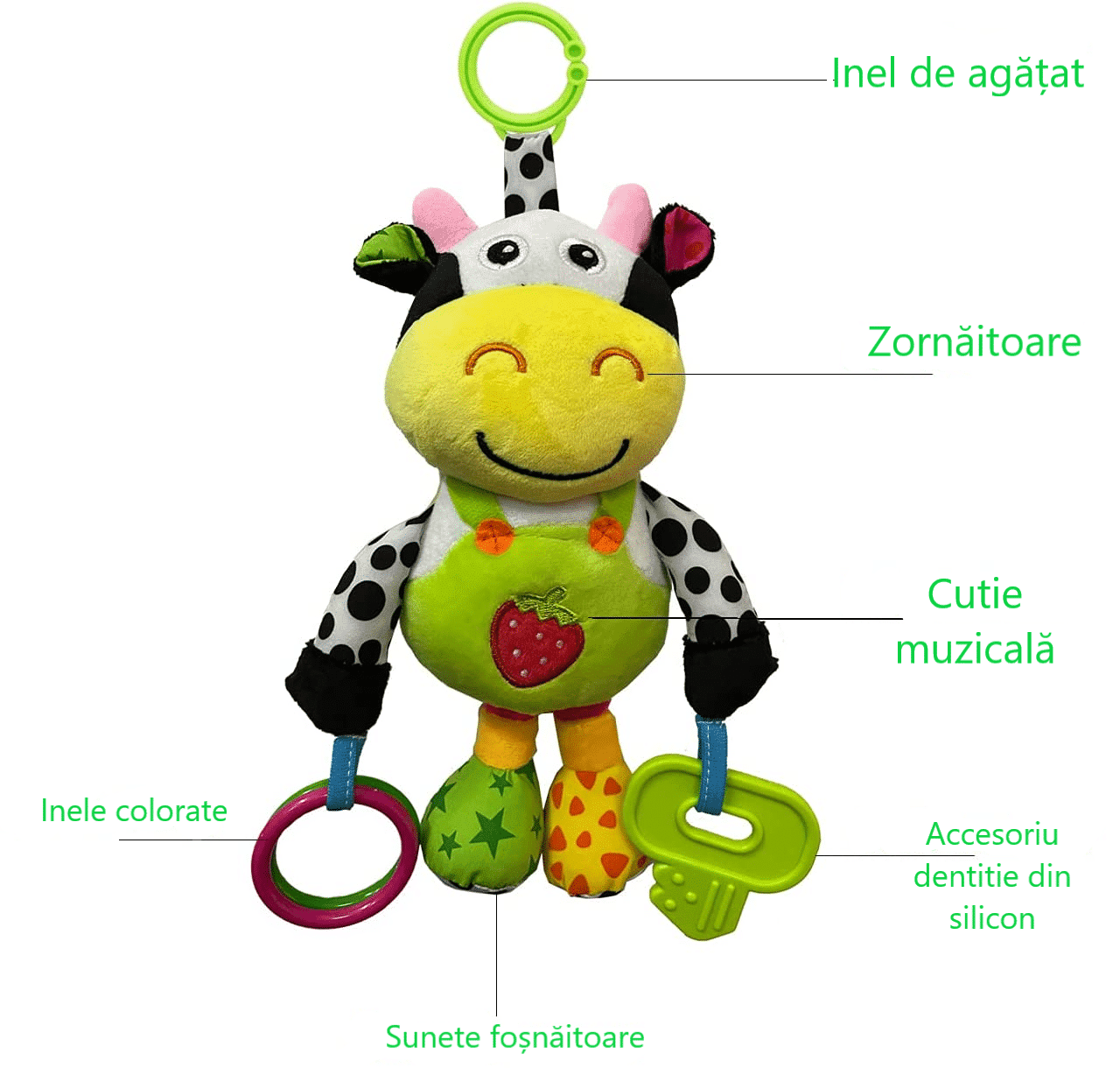 Aceasta jucarie multifunctionala confectionata din materiale de calitate foarte buna va capta cu siguranta atentia bebelusului dumneavoastra si va deveni in scurt timp una din favoritele sale. Este ideala pentru calmarea si atentia copilului. Jucaria canta melodii atunci cand este apasata burtica vacutei.